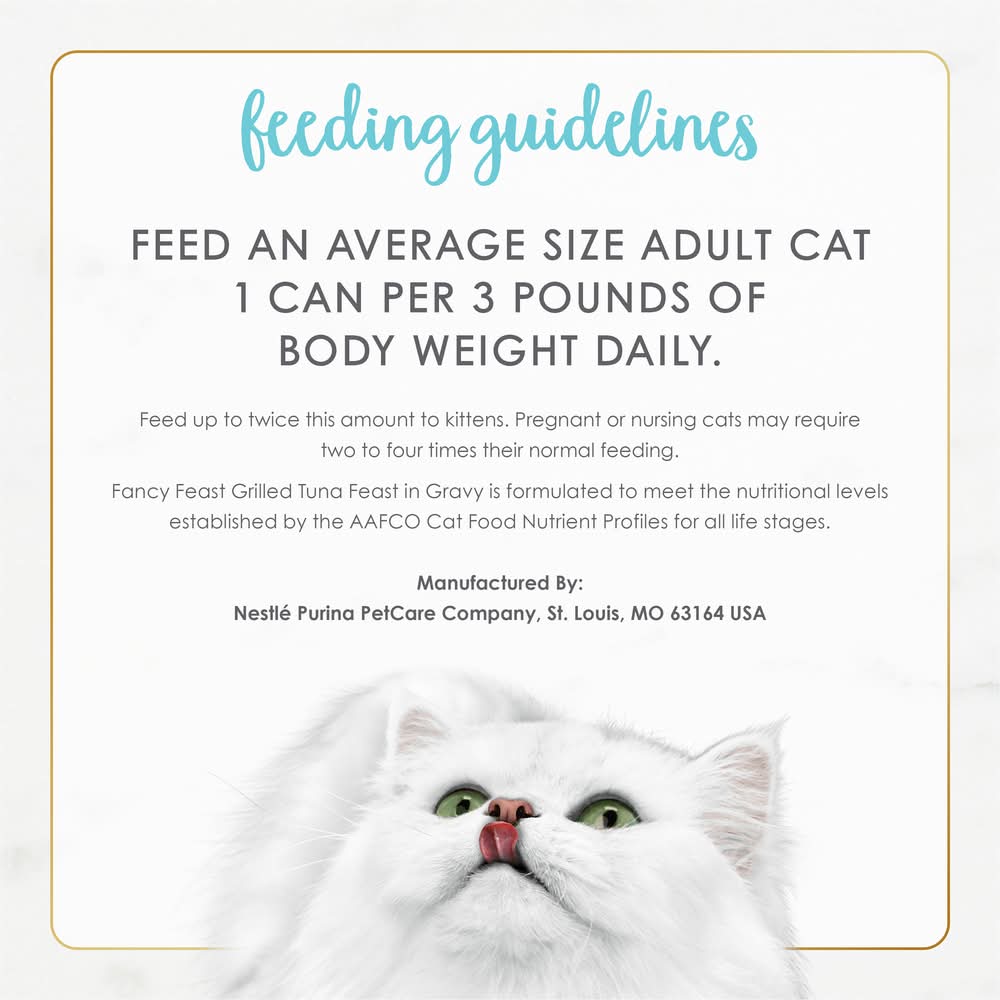 Let Fancy Feast delight your cat with an exceptional mealtime experience every time you open a can of Fancy Feast Grilled Cat Food Tuna in Gravy Cat Food. Crafted in partnership with our expert chefs and nutritionists, this protein-rich, wet food for cats features the irresistible taste of real tuna while delivering 100 percent complete and balanced nourishment. Also included in this flavorful, high-quality soft cat food is a blend of vitamins and minerals to support your cat’s whole-body health and a light, savory cat food gravy to tempt their tastebuds. This premium canned cat food recipe is made without artificial colors or preservatives, so you know your cat is getting everything they need and nothing they don’t. Show your cat how much you care with a can of Grilled Fancy Feast wet cat food and watch them savor the spellbinding aroma, enticing texture and delectable flavor sensation down to the very last bite. Size: 3 OZ