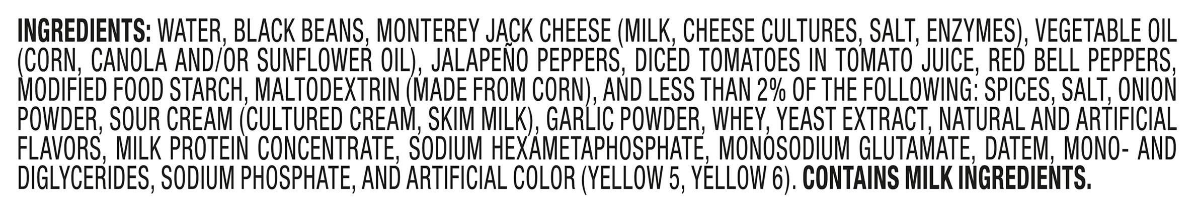 Ingredients: Water, Black Beans, Monterey Jack Cheese (Milk, Cheese Cultures, Salt, Enzymes), Vegetable Oil (Corn, Canola and/or Sunflower Oil), Jalapeno Peppers, Diced Tomatoes in Tomato Juice, Red Bell Peppers, Modified Food Starch, Maltodextrin (Made from Corn), and Less than 2% of the Following: Spices, Salt, Onion Powder, Sour Cream (Cultured Cream, Skim Milk), Garlic Powder, Whey, Yeast Extract, Natural and Artificial Flavors, Milk Protein Concentrate, Sodium Hexametaphosphate, Monosodium Glutamate, DATEM, Mono- and Diglycerides, Sodium Phosphate, and Artificial Color (Yellow 5, Yellow 6) Contains: Milk, Corn