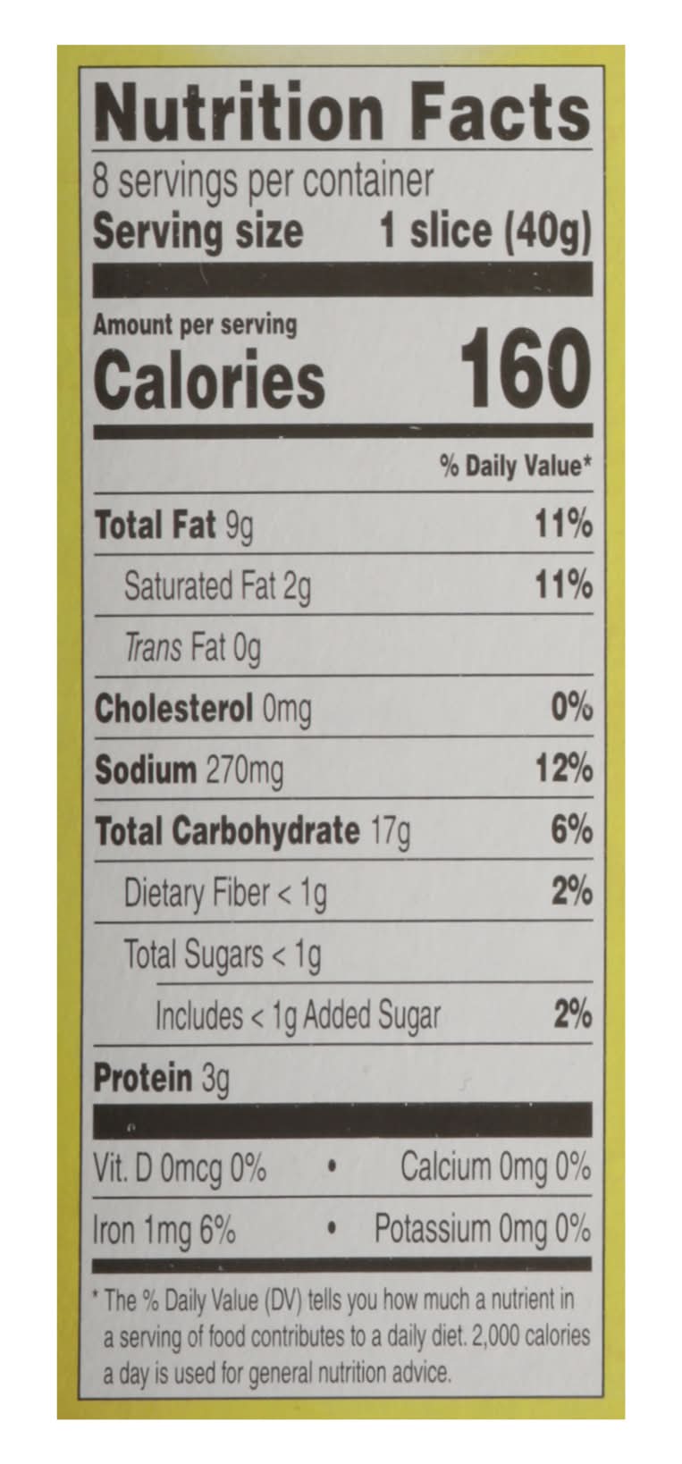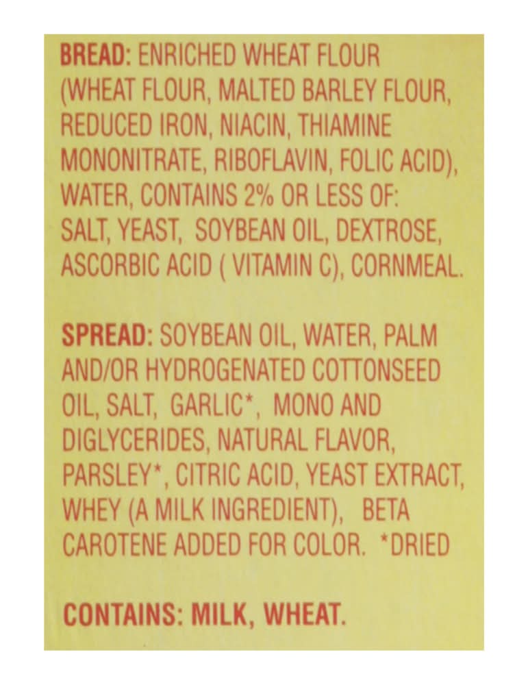Ingredients: Bread: Enriched Wheat Flour (Wheat Flour, Malted Barley Flour, Reduced Iron, Niacin, Thiamine Mononitrate, Riboflavin, Folic Acid), Water, Contains 2% or Less of: Salt, Yeast, Soybean Oil, Dextrose, Ascorbic Acid (Vitamin C), Cornmeal. Spread: Soybean Oil, Water, Palm and/or Hydrogenated Cottonseed Oil, Salt, Garlic (Dried), Mono and Diglycerides, Natural Flavor, Parsley (Dried), Citric Acid, Yeast Extract, Whey (a Milk Ingredient), Beta Carotene Added for Color Contains: Milk, Wheat, Soybeans, Barley, Corn
