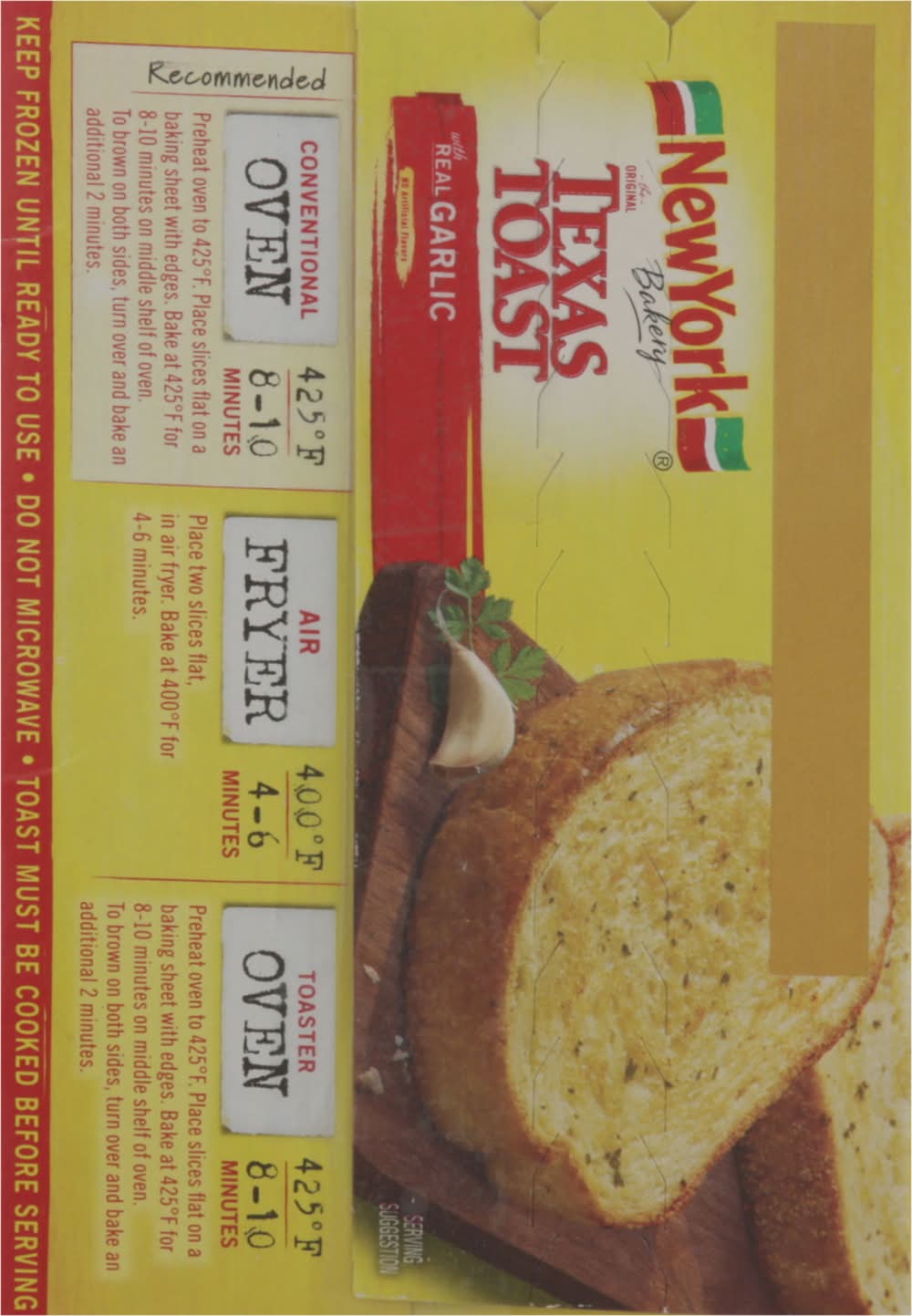 Directions for use: Preheat 425 degrees F. 5-8 minutes. Please see side panel for complete heating instruction. Recommended: Oven and toaster oven: Preheat oven to 425 degrees F. Place slices flat on a baking sheet with edges. Bake at 425 degrees F for 5-8 minutes on middle shelf of oven. To brown on both sides, turn over and bake an additional 2 minutes. On the Grill: Grill slices over medium hot grill for 1-1/2 to 3 minutes, turning every 15-30 seconds until toasted golden brown. Stove Top: Place slices in non-stick pan or on flat top griddle. Cover. Cook over medium heat for 1-1/2 to 3 minutes per side. Keep frozen until ready to use. Do not microwave. Toast must be cooked before serving. Keep frozen. Storage recommendation: Keep frozen