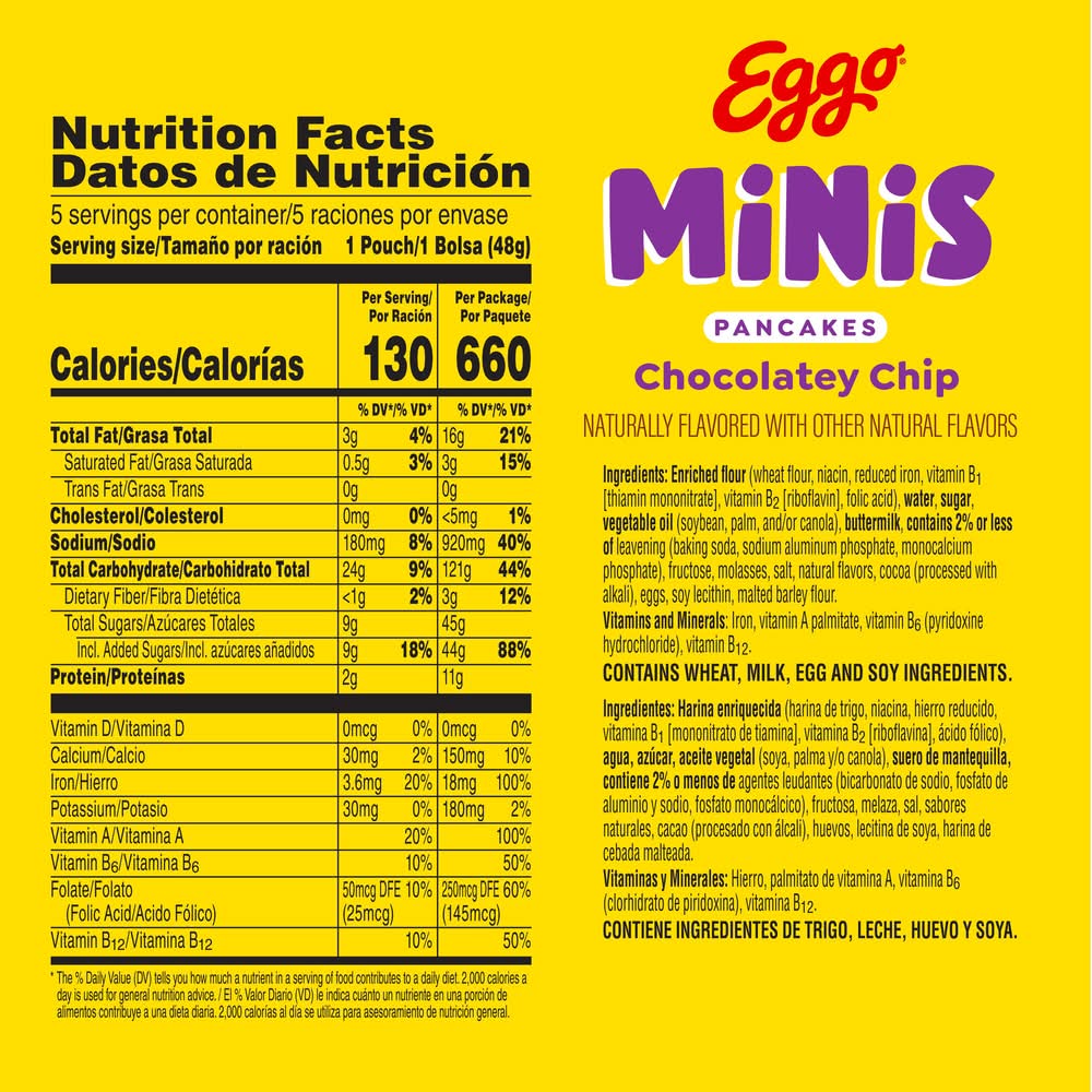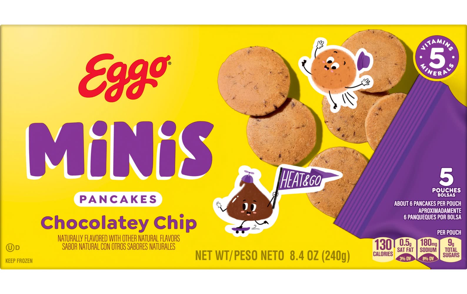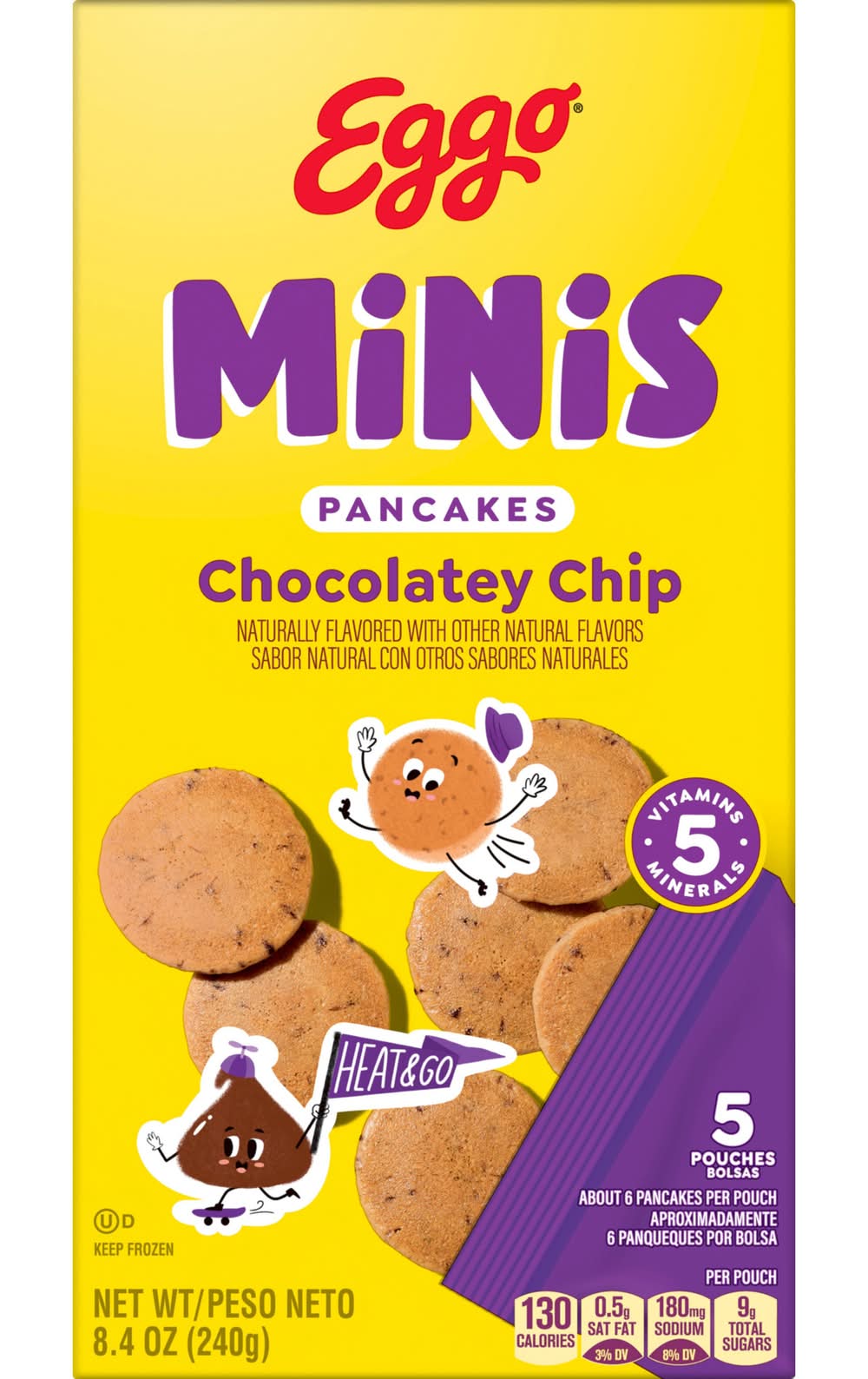 Wake up and greet the day with the feel-good taste of Eggo Minis Chocolatey Chip frozen pancake bites. Convenient and easy to prepare, Eggo Minis pancakes bring warmth to busy mornings. Great for families and individuals, these delicious pancakes are made to enjoy as a stand-alone breakfast treat or with your favorite morning toppings like butter and syrup, jellies and preserves, and whipped cream. Our Eggo Minis pancakes provide a good source of 5 vitamins and minerals. Easily pop into the microwave, heat, and enjoy. Perfect for little toddler fingers or for a quick late-night bite, dig in to Eggo Minis pancakes whenever you're feeling hungry. • Flavor: Chocolatey chip • Size: 8.4 OZ • Number of servings: 5 • Kellogg Sales Co., Battle Creek, MI, 49016 • Packaging: Reusable