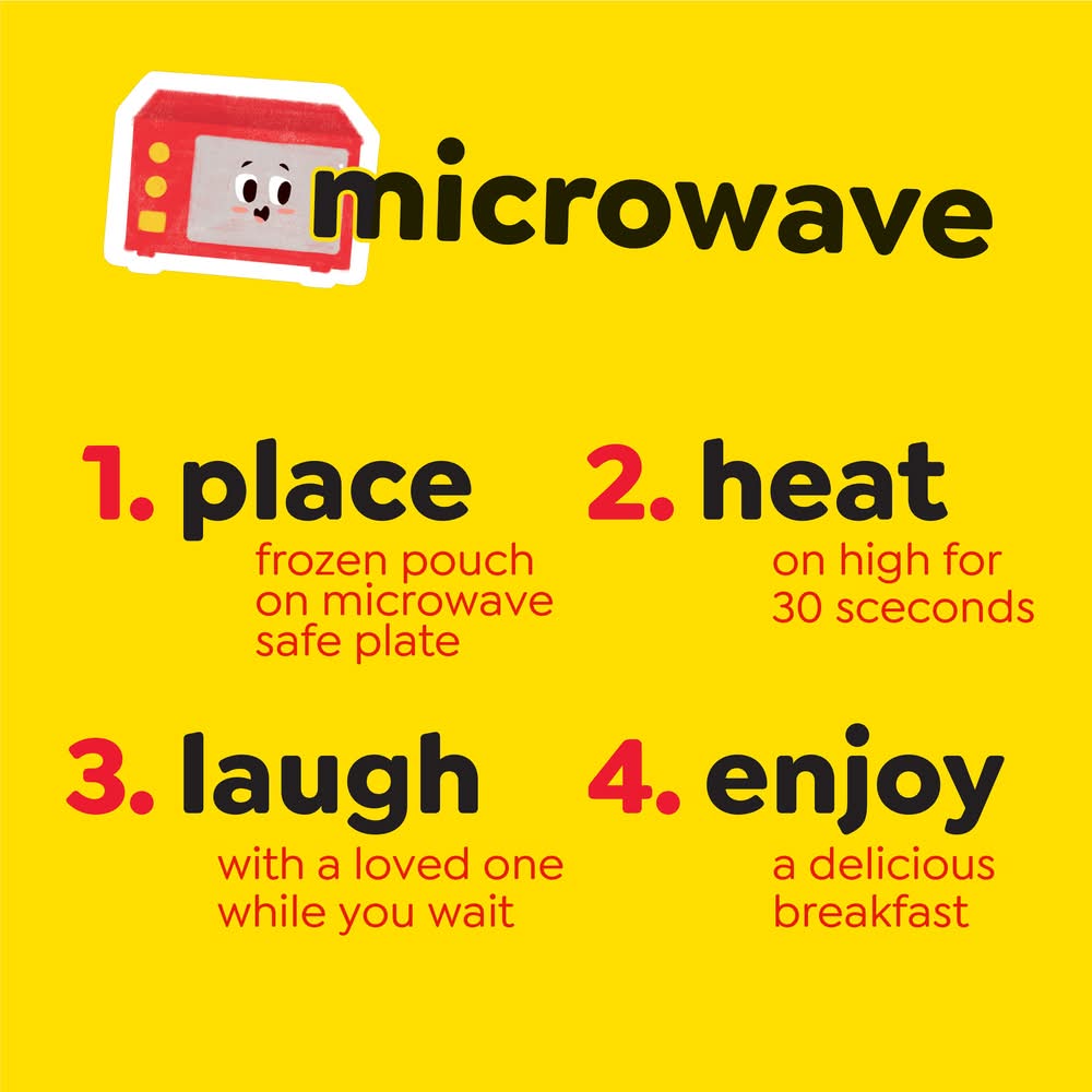 Directions for use: Microwave 1. Separate frozen pouches and heat only one pouch at a time. 2. Open one end of frozen pouch to vent during heating. 3. Place one pouch on a microwave-safe plate. 4. Heat on high for 30 seconds. 5. Let stand in microwave for 30 seconds before eating. Heating instructions developed using 1100 watt microwave. Microwave ovens vary. If additional time is needed, increase time by 5 second intervals. Overheating can cause pancakes to toughen. Heating Directions: Keep frozen until ready to use. Do not refreeze thawed product. Heat before eating. Caution: Appliance capabilities vary. Please refer to manufacturer's instructions. Never leave cooking appliance unattended while in use. Children should be supervised.Keep frozen.Lift to open. Storage recommendation: Keep frozen.