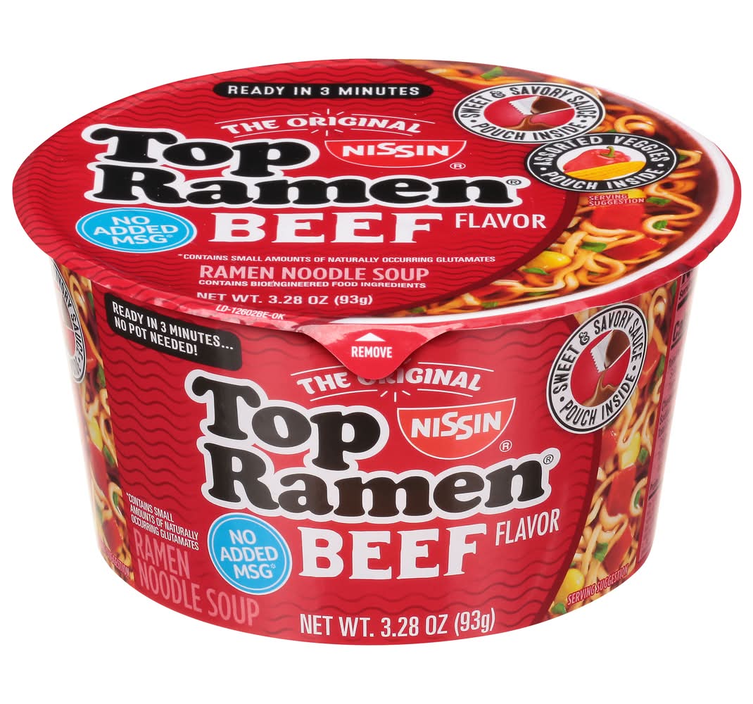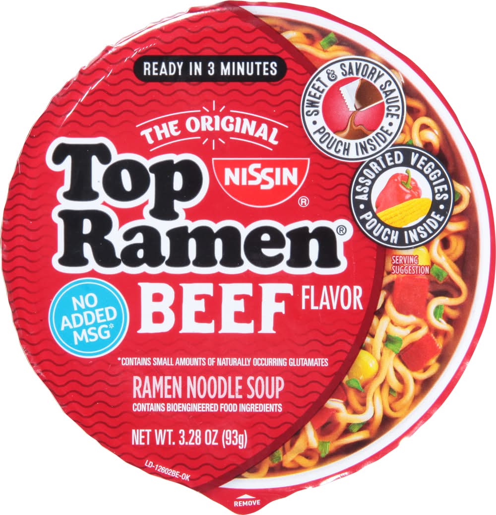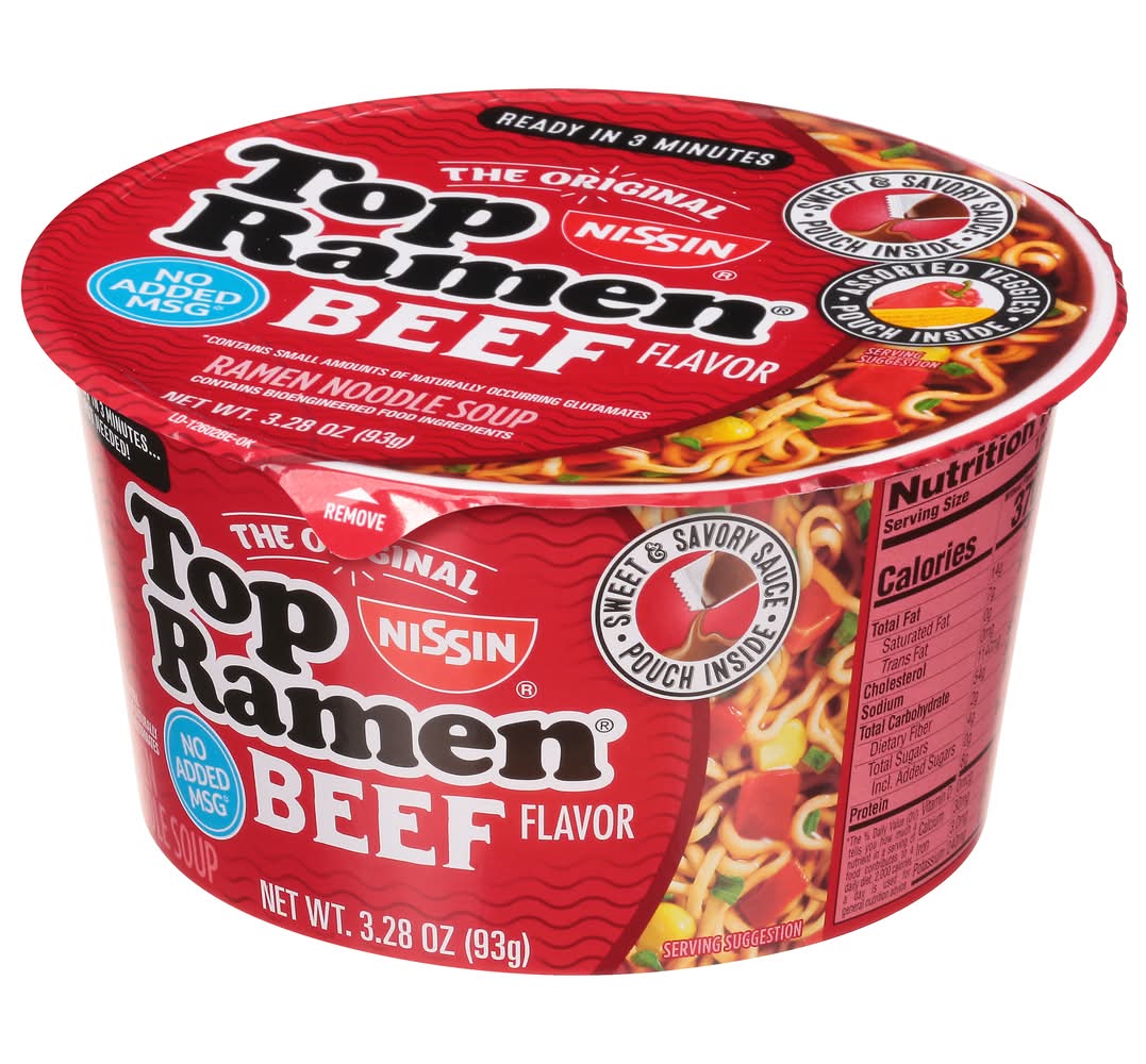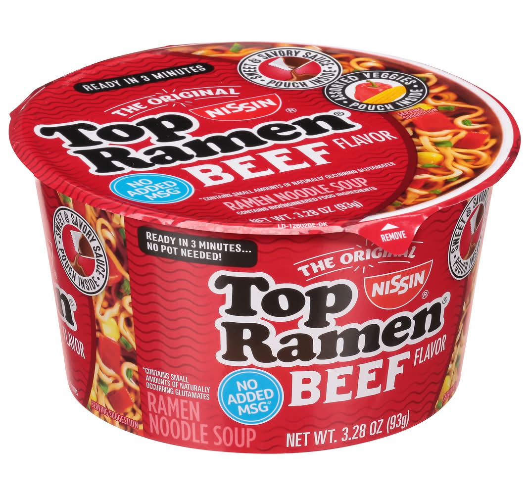 Ramen Noodle Soup, Beef Flavor • Flavor: Beef • Size: 3.28 OZ • Nissin Foods (USA) Co., Inc., 2001 W. Rosecrans Ave., Gardena, CA, 90249