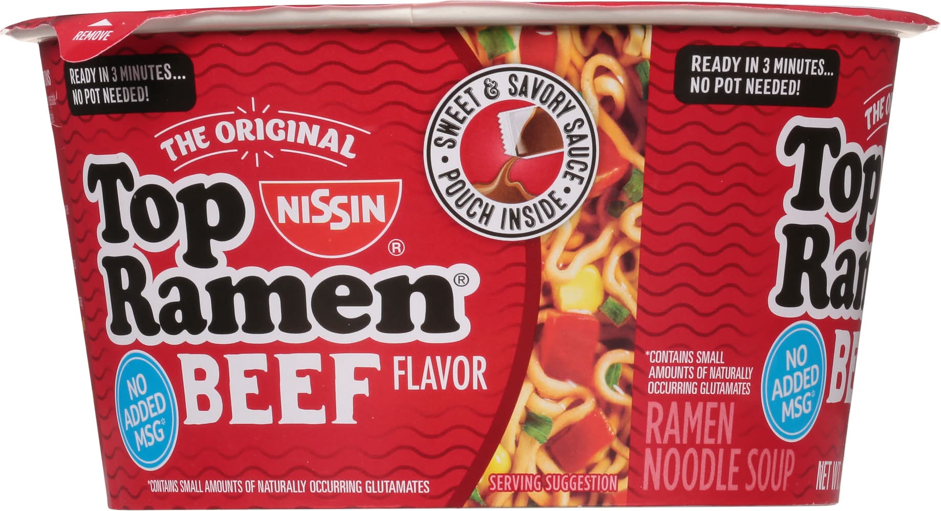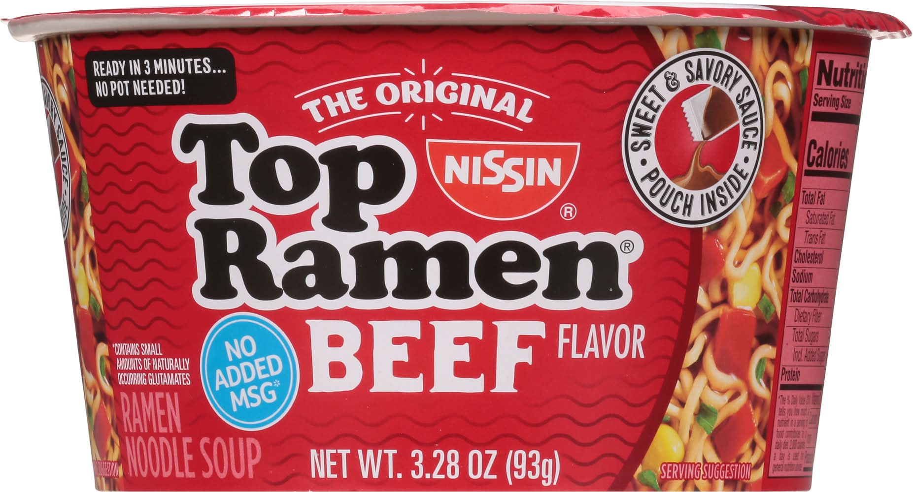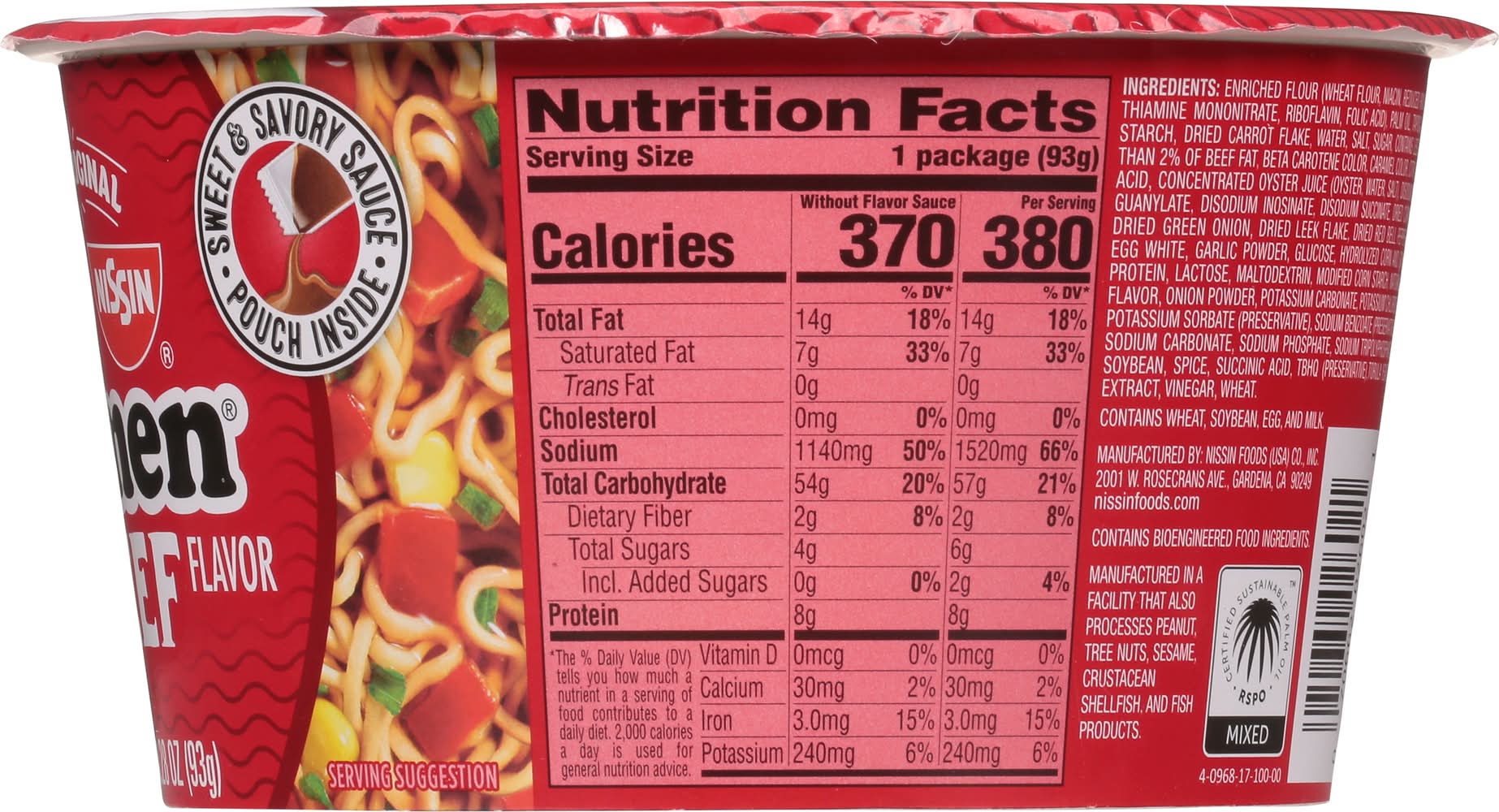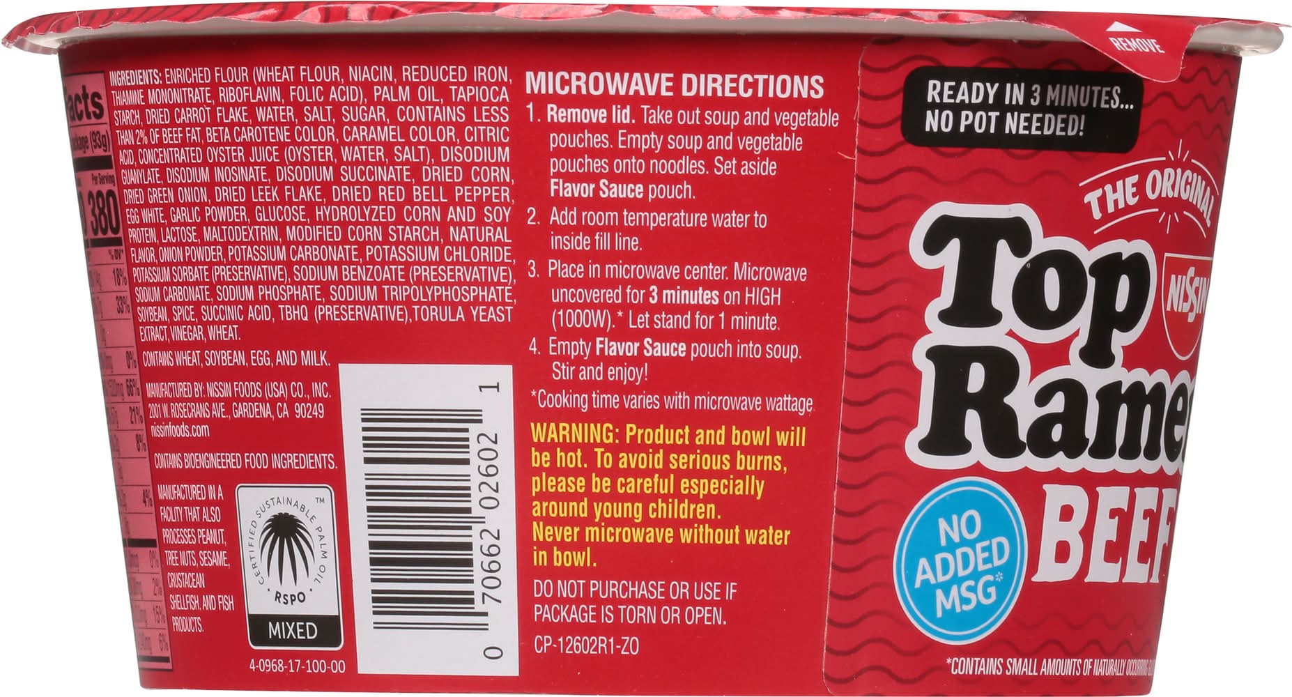 Ramen Noodle Soup, Beef Flavor • Flavor: Beef • Size: 3.28 OZ • Nissin Foods (USA) Co., Inc., 2001 W. Rosecrans Ave., Gardena, CA, 90249