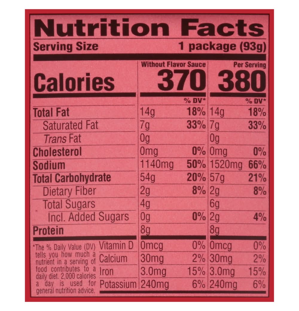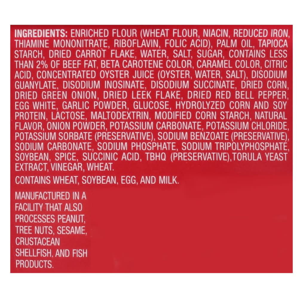 Ingredients: Enriched Flour (Wheat Flour, Niacin, Reduced Iron, Thiamine Mononitrate, Riboflavin, Folic Acid), Palm Oil, Tapioca Starch, Dried Carrot Flake, Water, Salt, Sugar, Contains Less than 2% of Beef Fat, Beta Carotene Color, Caramel Color, Citric Acid, Concentrated Oyster Juice (Oyster, Water, Salt), Disodium Guanylate, Disodium Inosinate, Disodium Succinate, Dried Corn, Dried Green Onion, Dried Leek Flake, Dried Red Bell Pepper, Egg White, Garlic Powder, Glucose, Hydrolyzed Corn and Soy Protein, Lactose, Maltodextrin, Modified Corn Starch, Natural Flavor, Onion Powder, Potassium Carbonate, Potassium Chloride, Potassium Sorbate (Preservative), Sodium Benzoate (Preservative), Sodium Carbonate, Sodium Phosphate, Sodium Tripolyphosphate, Soybean, Spice, Succinic Acid, TBHQ (Preservative), Torula Yeast Extract, Vinegar, Wheat Contains: Wheat, Corn, Eggs, Soybeans, Lactose, Milk, Peanuts, Tree Nuts, Sesame, Crustacean Shellfish, Fish