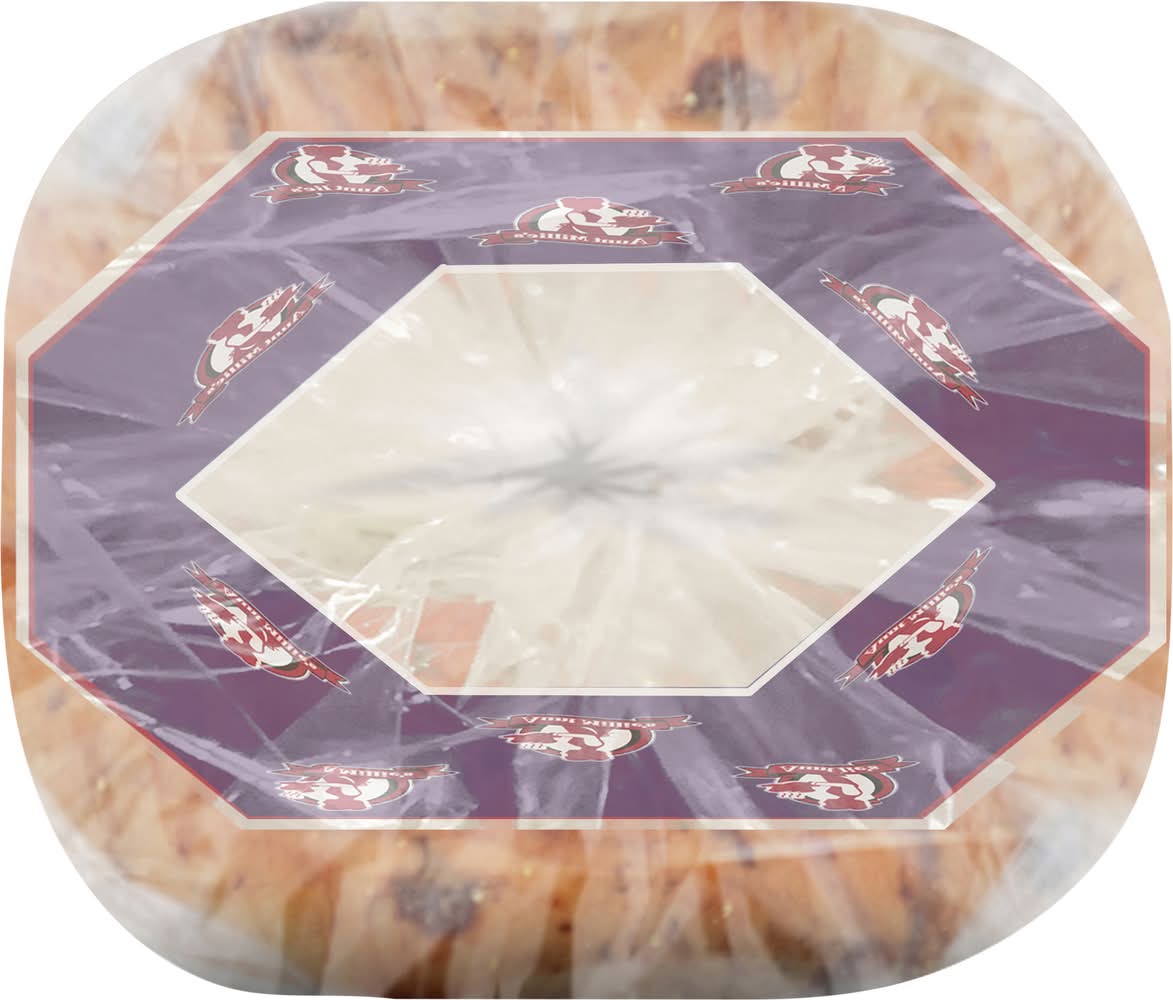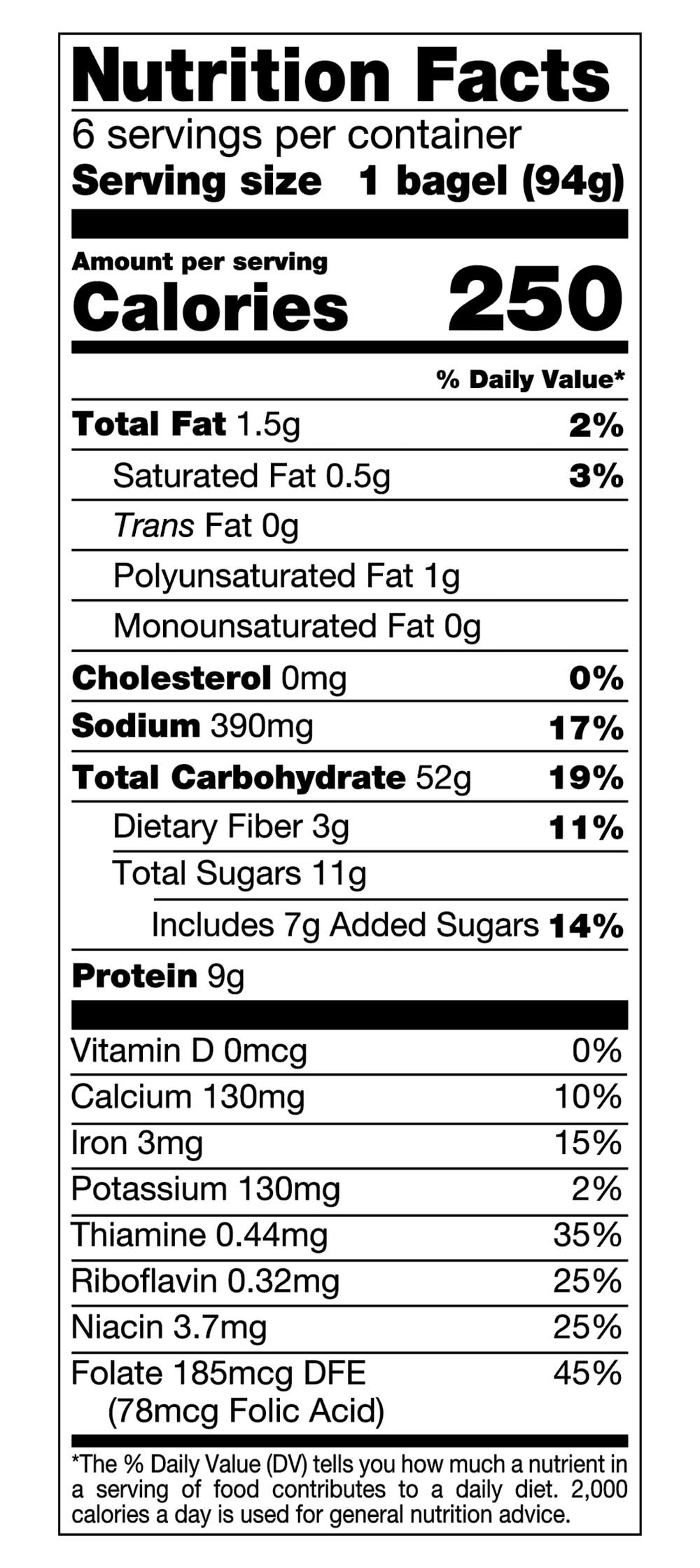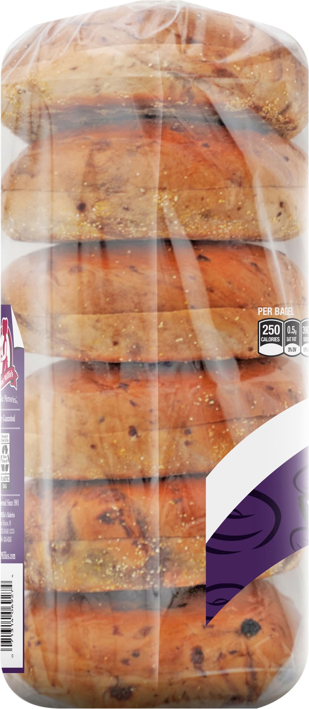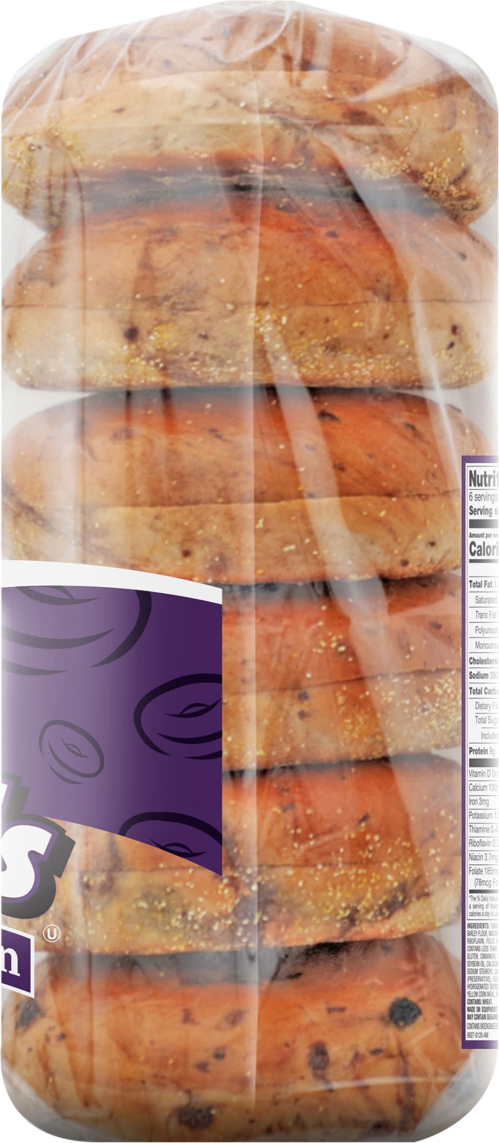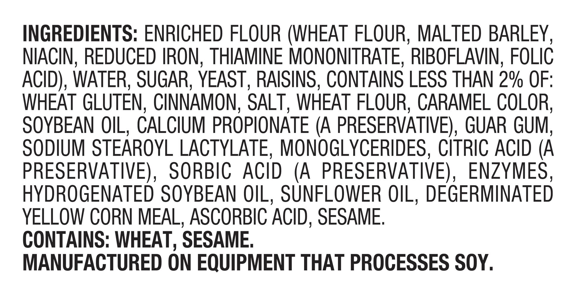 Ingredients: Enriched Flour (Wheat Flour, Malted Barley, Niacin, Reduced Iron, Thiamine Mononitrate, Riboflavin, Folic Acid), Water, Sugar, Yeast, Raisins, Contains Less than 2% of: Wheat Gluten, Cinnamon, Salt, Wheat Flour, Caramel Color, Soybean Oil, Calcium Propionate (a Preservative), Guar Gum, Sodium Stearoyl Lactylate, Monoglycerides, Citric Acid (a Preservative), Sorbic Acid (a Preservative), Enzymes, Hydrogenated Soybean Oil, Sunflower Oil, Degerminated Yellow Corn Meal, Ascorbic Acid, Sesame Contains: Wheat, Sesame, Barley, Gluten, Soybeans, Corn, Soybeans