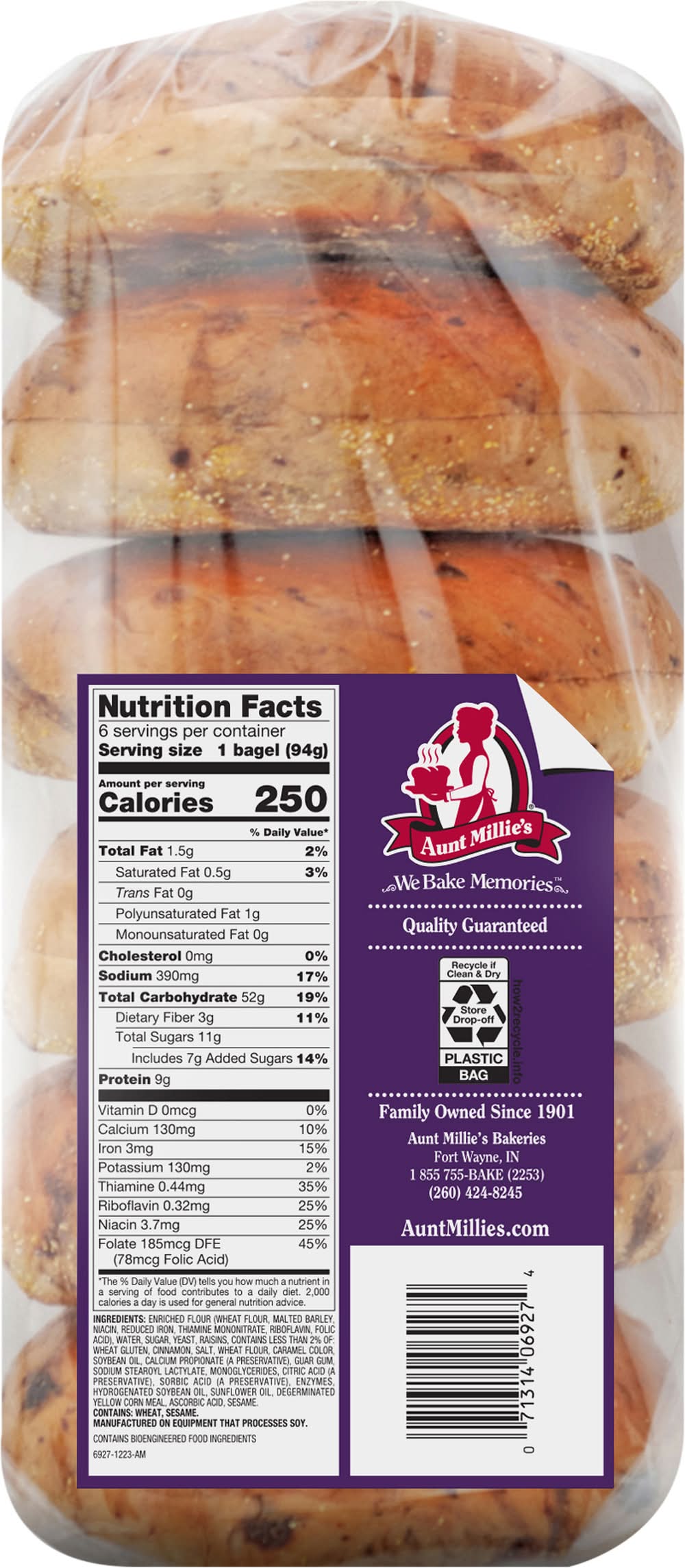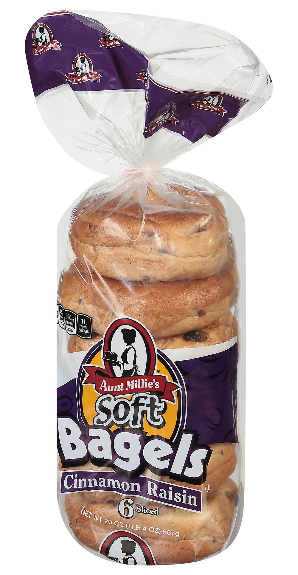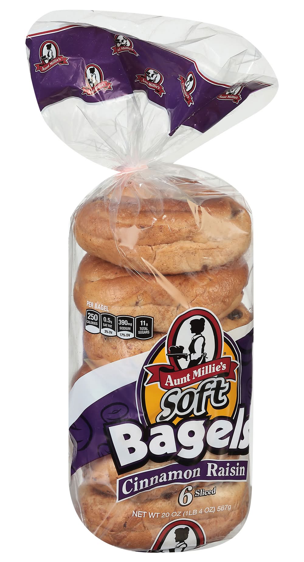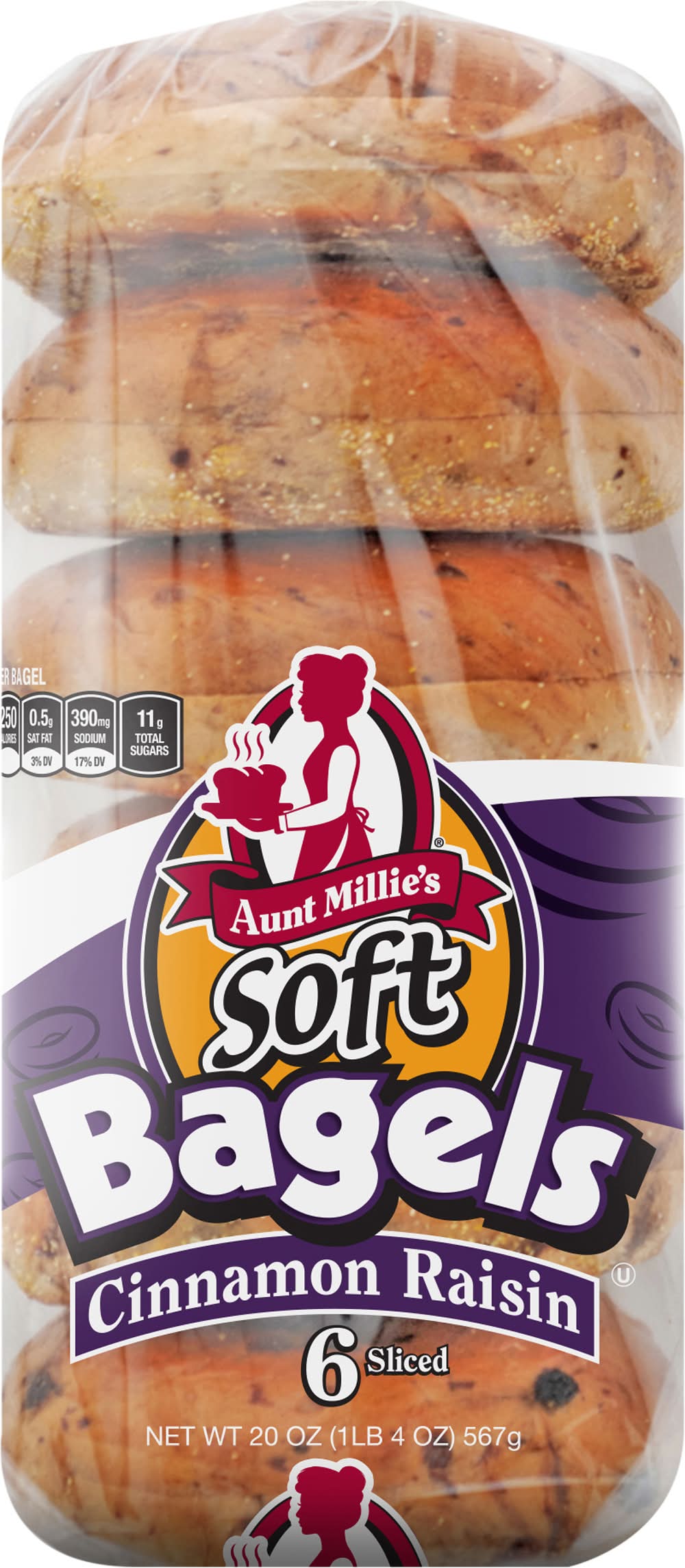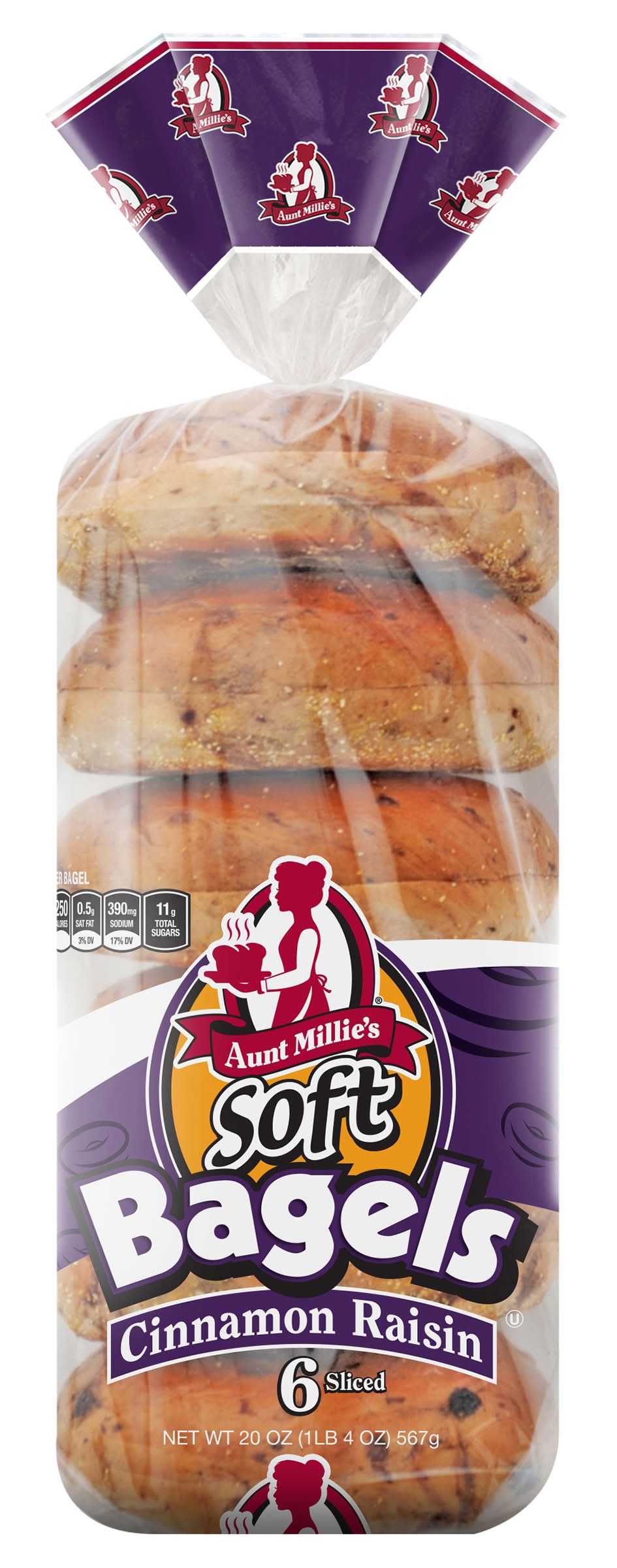Bagels, Cinnamon Raisin, Soft, Sliced • Size: 20 OZ • Number of servings: 6 • Aunt Millie's Bakeries, Fort Wayne, IN, 46802 • Packaging: Reusable