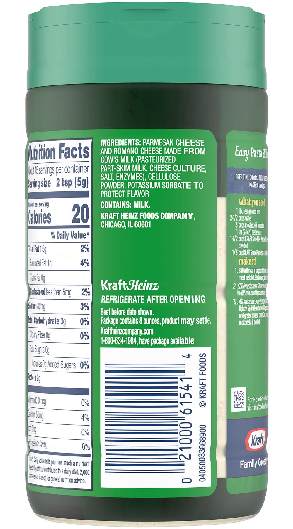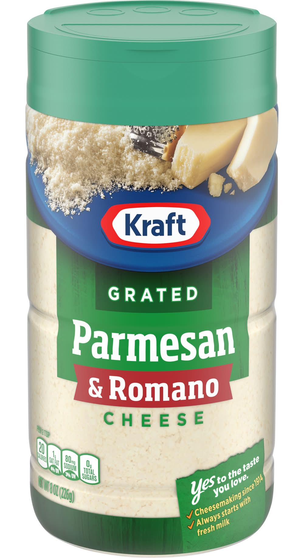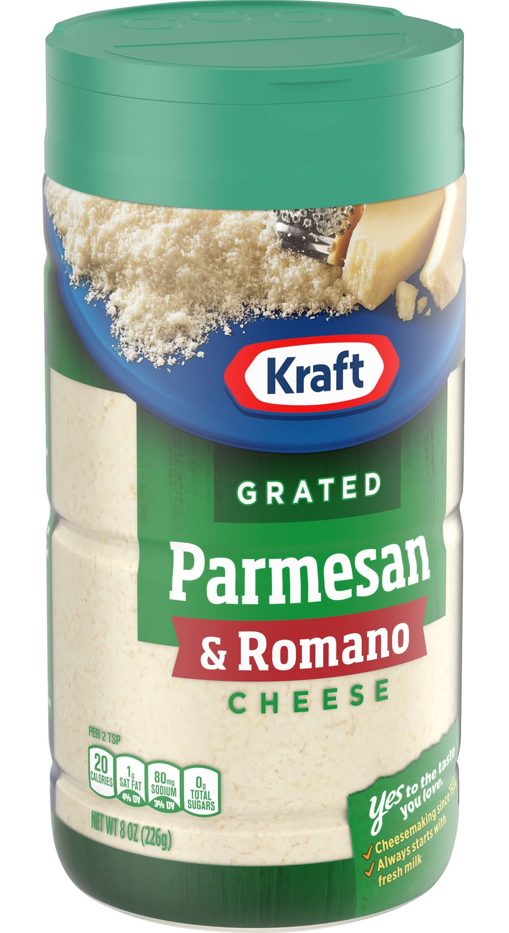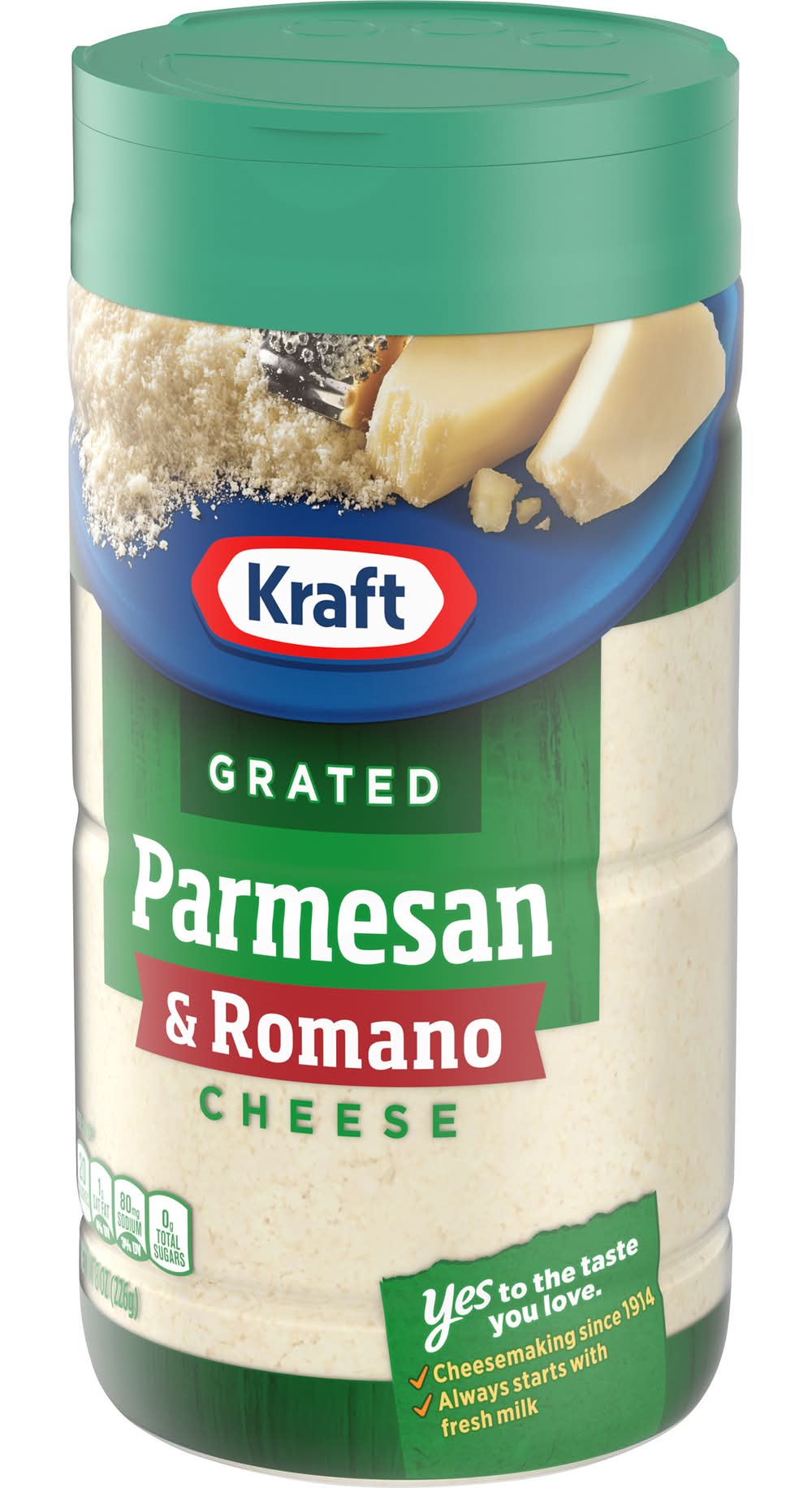 Yes to the taste you love. Cheesemaking since 1914. Always starts with fresh milk. Family greatly. Package contains 8 ounces, product may settle. Kraft Grated Parmesan and Romano Cheese made adds the zesty flavor of grated cheese to pizza, pasta, or anything else you can imagine. The shaker bottle allows for the easy addition of the perfect amount of grated cheese to your recipes and favorite dishes. This cheese blend is made from a mix of Parmesan and Romano cheese crafted from real, premium quality milk and grated into a fine powder. Its ideal for sprinkling on pasta, adding on top of pizza, or for use in your family's chicken Parmesan recipe. Packaged in an 8 ounce resealable shaker bottle for convenient storage and to help lock in flavor. • Size: 8 OZ • Kraft Heinz Foods Company, Chicago,IL,60601