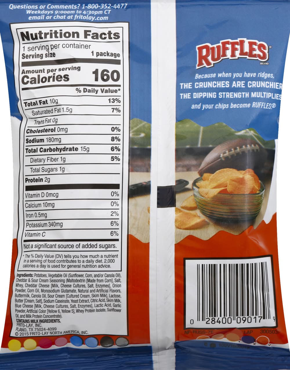 Because when you have ridges, the crunches are crunchier, the dipping strength multiplies, and your chips. • Flavor: Cheddar & sour cream • Size: 1 OZ • Frito-lay, inc., Plano, TX, 75024-4099
