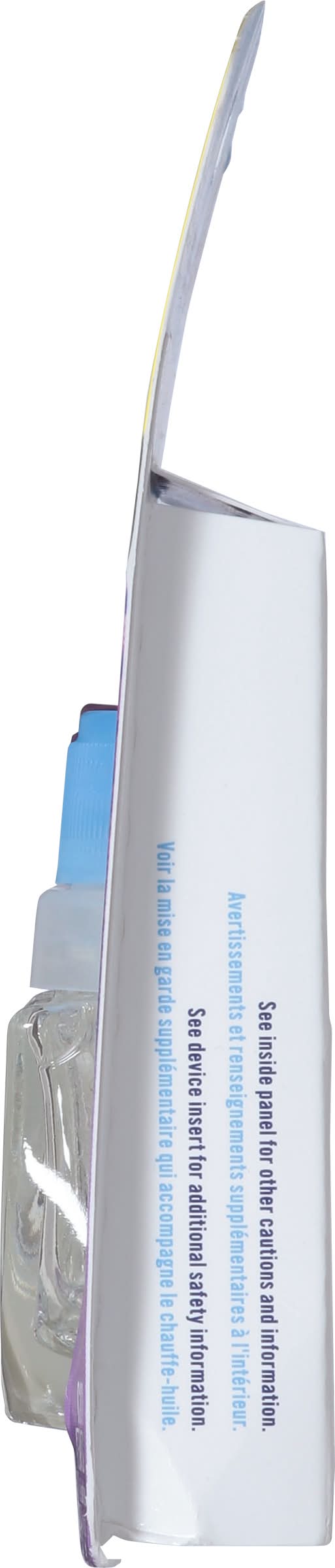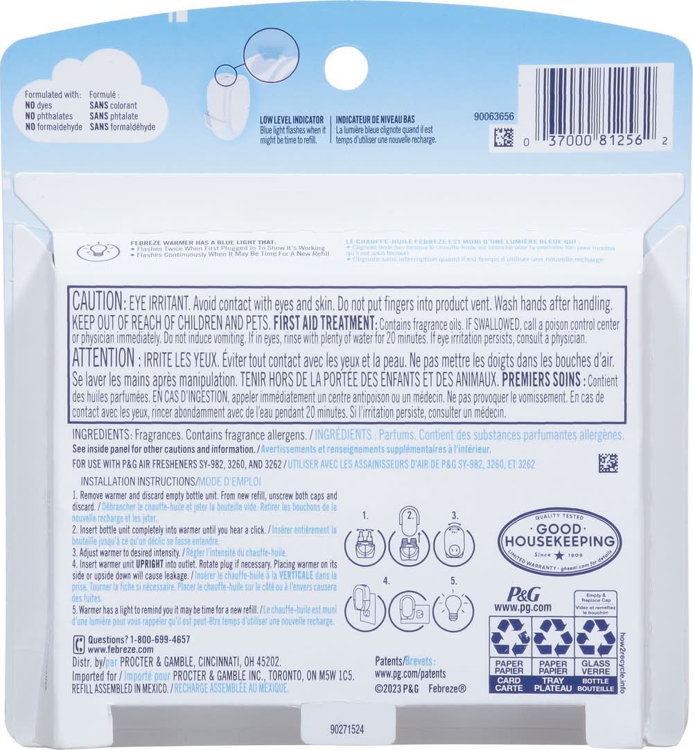 1st day fresh for 100 days (50 days each, on low). Scratch and sniff. Febreze Warmer has a Blue Light that: Flashes twice when first plugged in to show its working. Flashes continuously when it may be time for a new refill. Formulated with: No dyes; no phthalates; no formaldehyde. Low level indicator. • Size: 2 CT • Procter & Gamble, Cincinnati,OH,45202 • Packaging: Reusable