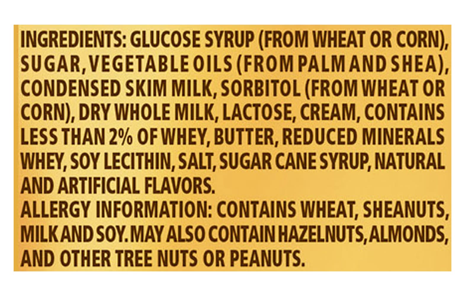 Ingredients: Glucose Syrup (from Wheat or Corn), Sugar, Vegetable Oils (from Palm and Shea), Condensed Skim Milk, Sorbitol (from Wheat or Corn), Dry Whole Milk, Lactose, Cream, Contains Less than 2% of Whey, Butter, Reduced Minerals Whey, Soy Lecithin, Salt, Sugar Cane Syrup, Natural and Artificial Flavors Contains: Wheat, Tree Nuts, Sheanuts, Milk, Soybeans, Corn, Lactose, Tree Nuts, Hazelnuts/Filberts, Tree Nuts, Almonds, Tree Nuts, Peanuts