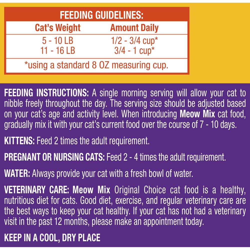 Directions for use: Directions: Keep in a cool, dry place. Feeding Guidelines: Cat's Weight: 5 - 10 lb; Amount daily: 1/2 - 3/4 cup (Using a standard 8 oz measuring cup). Cat's Weight: 11 - 16 lb; Amount daily: 3/4 - 1 cup (Using a standard 8 oz measuring cup). Feeding Instructions: A single morning serving will allow your cat to nibble freely throughout the day. The serving size should be adjusted based on your cat's age and activity level. When introducing Meow Mix cat food, gradually mix it with your cat's current food over the course of 7-10 days. Kittens: Feed 2 times the adult requirement. Pregnant or nursing cats: Feed 2-4 times the adult requirement. Water: Always provide your cat with a fresh bowl of water. Veterinary Care: Meow Mix cat food is a healthy, nutritious diet for cats. Good diet, exercise, and regular veterinary care are the best ways to keep your cat healthy. If your cat has not had a veterinary visit in the past 12 months, please make an appointment today. Storage recommendation: Keep in a cool, dry place.
