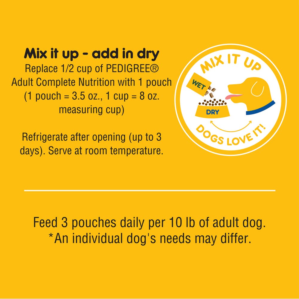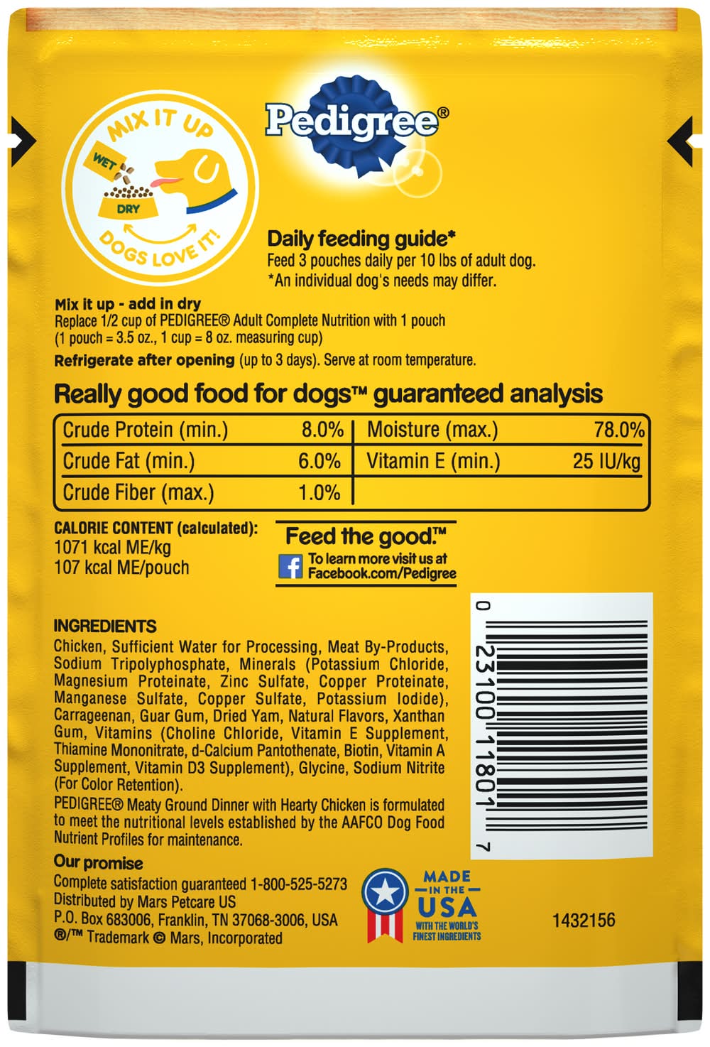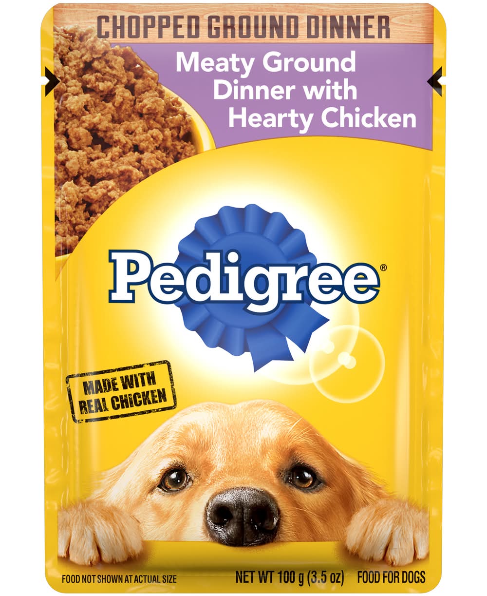 PEDIGREE CHOPPED GROUND DINNER wet dog food with Hearty Chicken delivers the taste dogs crave with the nutrition they need. Your dog can enjoy the delicious taste of real chicken in every bite! Our formulas for adult dogs of all sizes provide the perfect balance of vitamins and minerals with no artificial flavor, no added sugar, and no high fructose corn syrup. Each recipe is 100% complete and balanced for canines, so you know they’re getting the most out of their diet. Serve as a topper, a mixer with dry dog food, or a complete meal. Feed your dog nutritious food for a healthy, happy life with PEDIGREE Pouches. Size: 1 CT