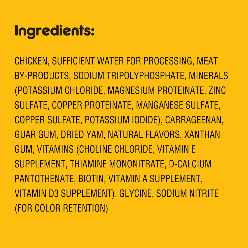 Ingredients: INGREDIENTS: Chicken, Sufficient Water For Processing, Meat By-Products, Animal Liver, Minerals (Potassium Chloride, Magnesium Proteinate, Zinc Sulfate, Copper Proteinate, Manganese Sulfate, Copper Sulfate, Potassium Iodide), Carrageenan, Sodium Tripolyphosphate, Dried Yam, Xanthan Gum, Vitamins (Choline Chloride, Vitamin E Supplement, Thiamine Mononitrate, Calcium Pantothenate, Biotin, Riboflavin Supplement, Vitamin A Supplement, Vitamin D3 Supplement, Vitamin B12 Supplement), Natural Flavor, Guar Gum, Sodium Nitrite (For Color Retention), .