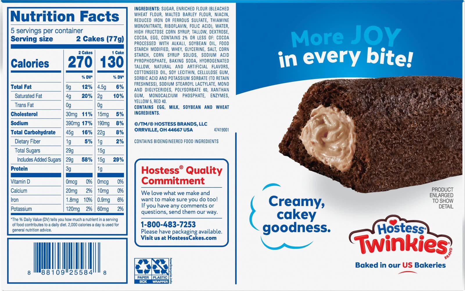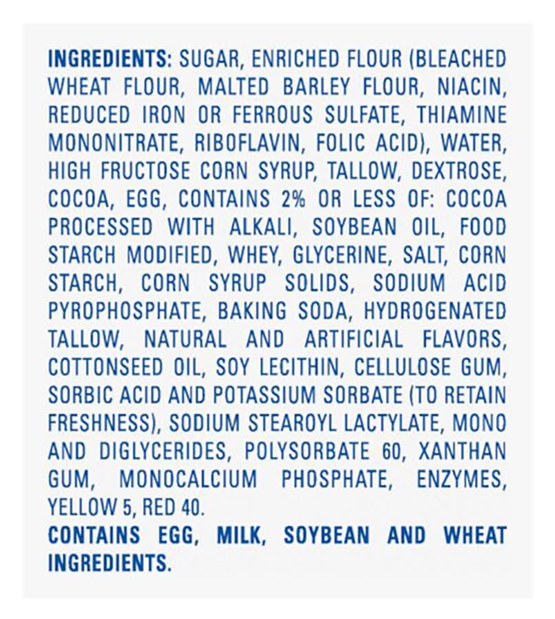Ingredients: Sugar, Enriched Flour (Bleached Wheat Flour, Malted Barley Flour, Niacin, Reduced Iron or Ferrous Sulfate, Thiamine Mononitrate, Riboflavin, Folic Acid), Water, High Fructose Corn Syrup, Tallow, Dextrose, Cocoa, Egg, Contains 2% or Less of: Cocoa Processed with Alkali, Soybean Oil, Food Starch Modified, Whey, Glycerine, Salt, Corn Starch, Corn Syrup Solids, Sodium Acid Pyrophosphate, Baking Soda, Hydrogenated Tallow, Natural and Artificial Flavors, Cottonseed Oil, Soy Lecithin, Cellulose Gum, Sorbic Acid and Potassium Sorbate (to Retain Freshness), Sodium Stearoyl Lactylate, Mono and Diglycerides, Polysorbate 60, Xanthan Gum, Monocalcium Phosphate, Enzymes, Yellow 5, Red 40. Contains: Eggs, Milk, Soybeans, Wheat, Barley