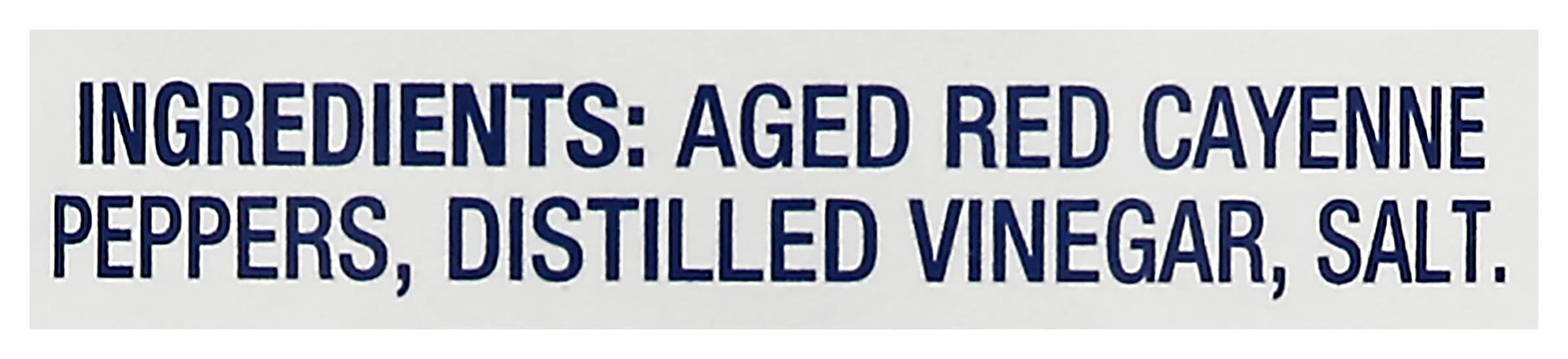 Ingredients: Aged Red Cayenne Peppers, Distilled Vinegar, Salt
