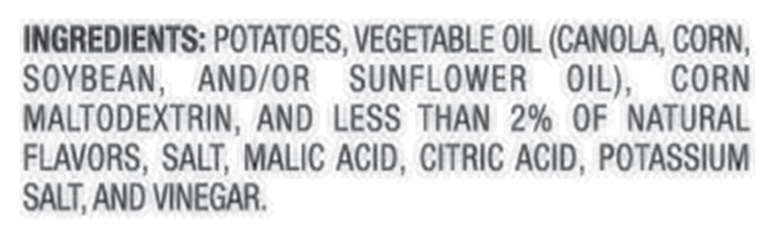 Ingredients: Potatoes, Vegetable Oil (Canola, Corn, Soybean, and/or Sunflower Oil), Corn Maltodextrin, and Less than 2% of Natural Flavors, Salt, Malic Acid, Citric Acid, Potassium Salt, and Vinegar Contains: Soybeans Additives: Kosher