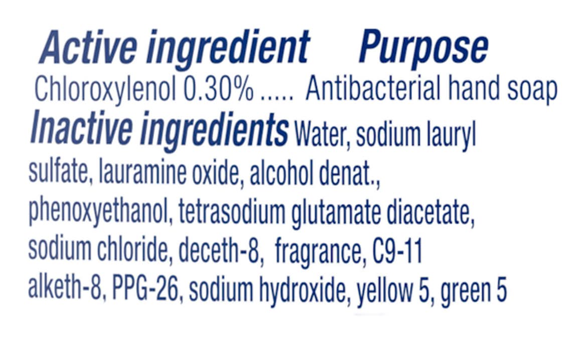 Ingredients: Active Ingredients: Chloroxylenol (0.30 %), Antibacterial Hand Soap. Inactive Ingredients: Water, Sodium Lauryl Sulfate, Lauramine Oxide, Alcohol Denat, Phenoxyethanol, Tetrasodium Glutamate Diacetate, Sodium Chloride, Deceth-8, Fragrance, C9-11 Alketh-8, PPG-26, Sodium Hydroxide, Yellow 5, Green 5