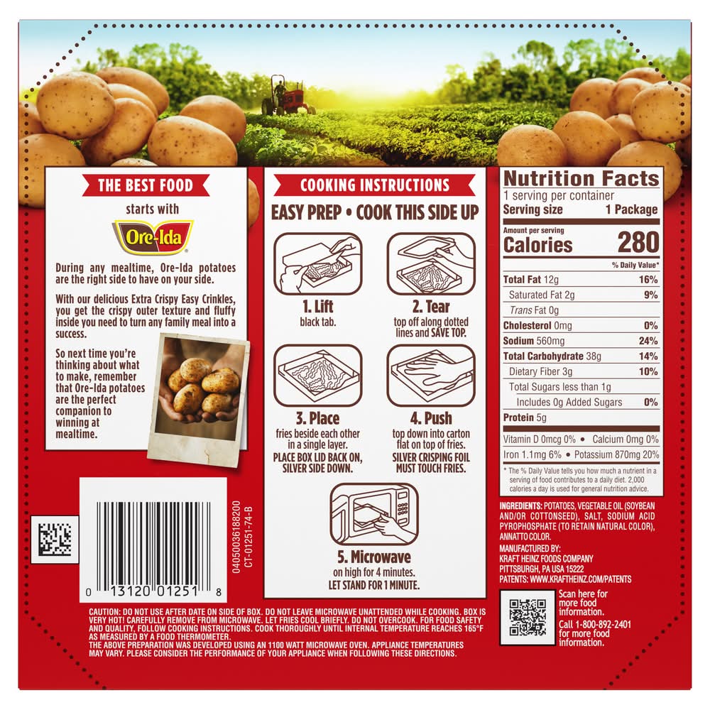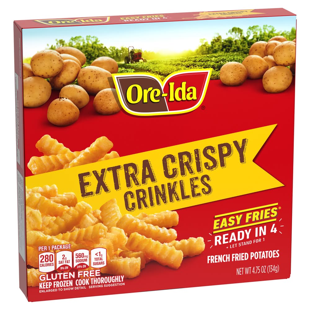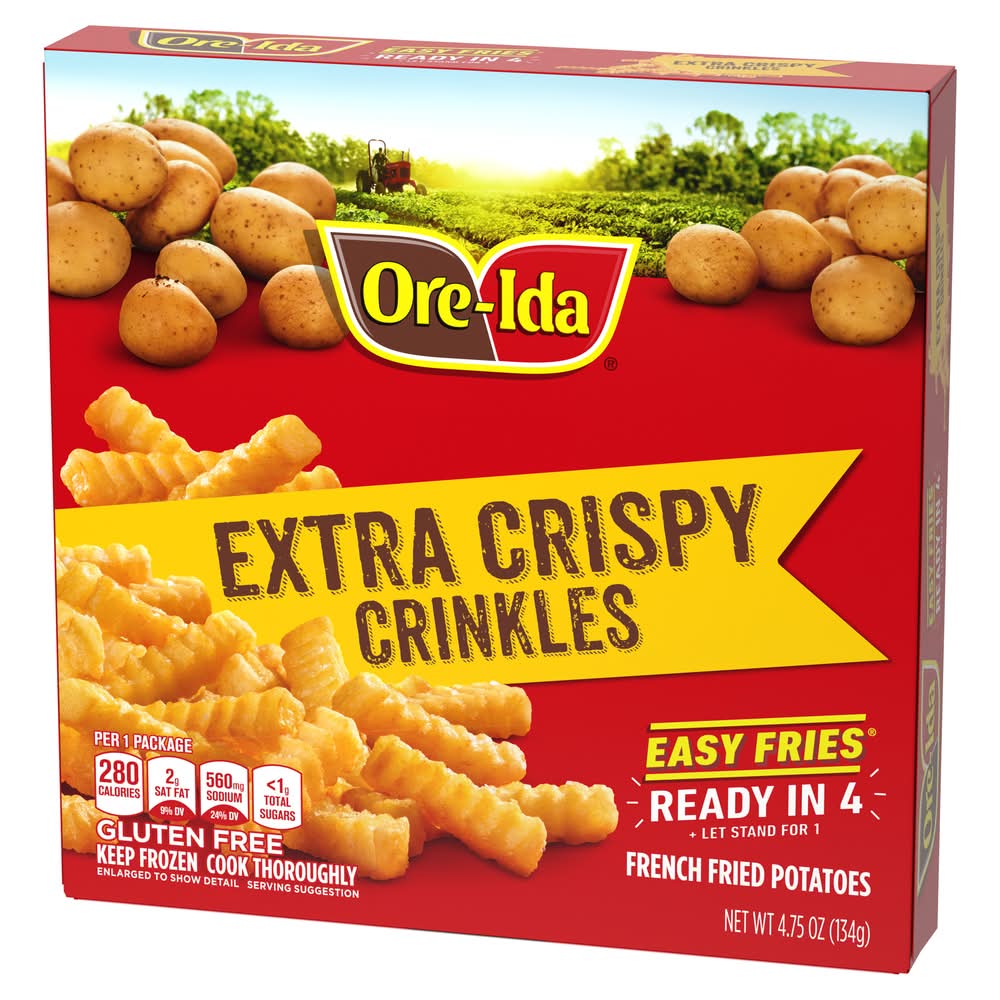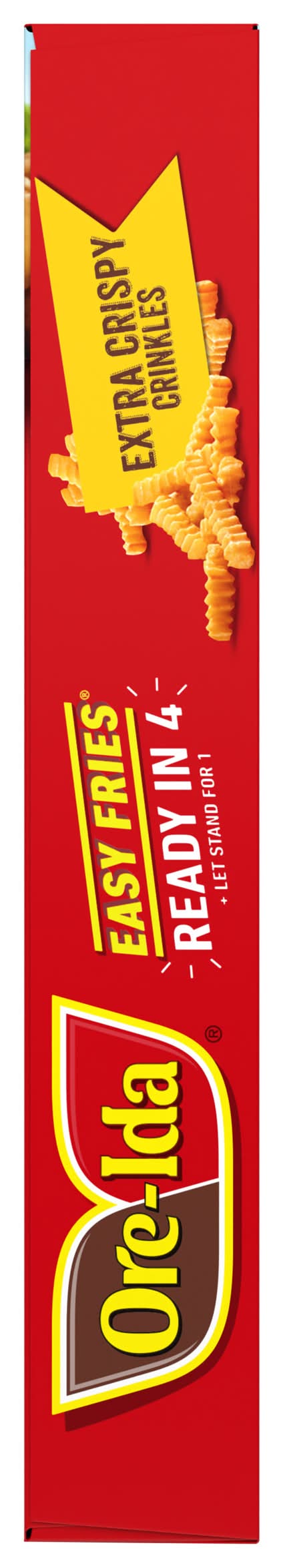 Ore-Ida Ready in 5 Extra Crispy Crinkles Fries make it easy to enjoy delicious fries from the microwave. Crispy and golden, these Grade A microwave fries are made from freshly peeled, American grown potatoes. These gluten free crinkle fries are deliciously crispy on the outside and light and tender on the inside for the perfect blend of textures to make your next family meal a success. With specially prepared Ore-Ida Golden Crinkles tucked between an upper and lower crisping sheet, the packaging lets the heat from your microwave cook them to crispy perfection in just four minutes. An American classic, these frozen French fries are the perfect quick snack or side dish. Serve up the traditional burger and fries, or get creative with loaded fries topped with cheese and bacon. These fries come packaged in a 4.75 ounce box for easy freezer storage. Your family deserves the highest quality because if it's not Grade A, it's not Ore-Ida! • Flavor: Ketchup-bacon • Size: 4.75 OZ