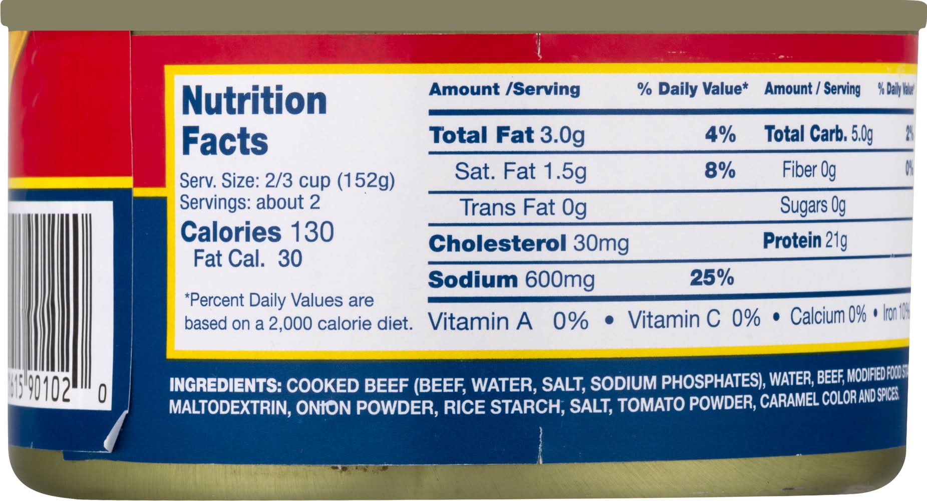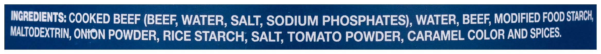 Ingredients: Cooked Beef (Beef, Water, Salt, Sodium Phosphates), Water, Beef, Modified Food Starch, Maltodextrin, Onion Powder, Rice Starch, Salt, Tomato Powder, Caramel Color and Spices