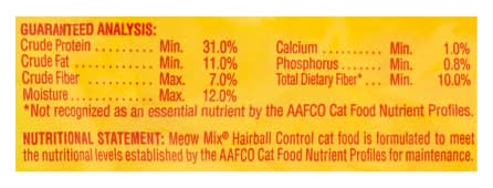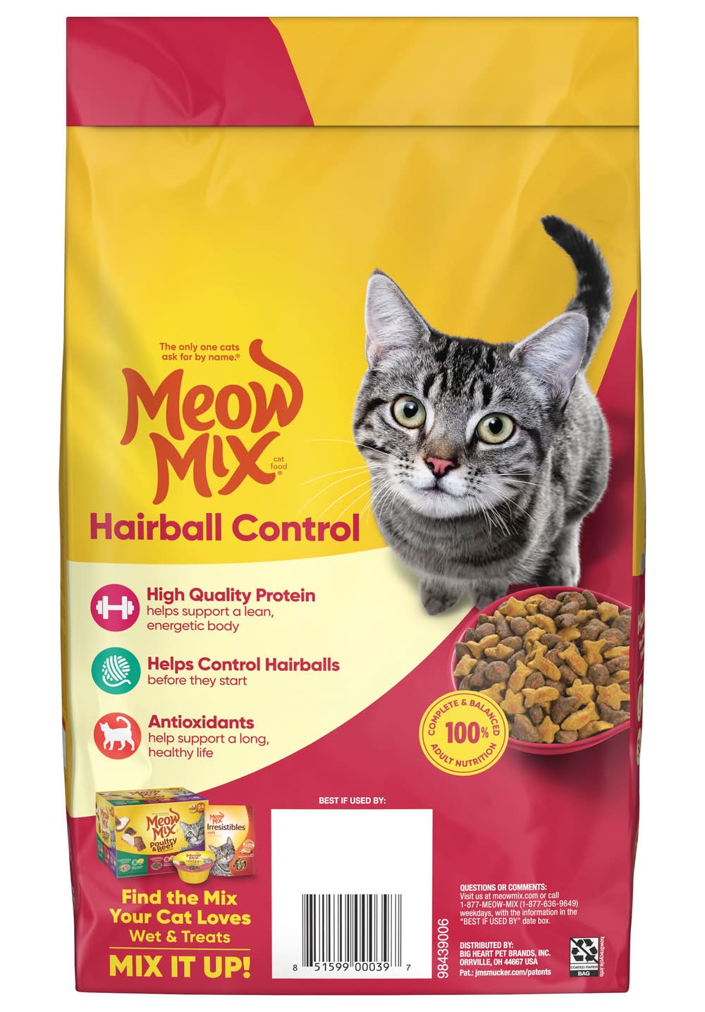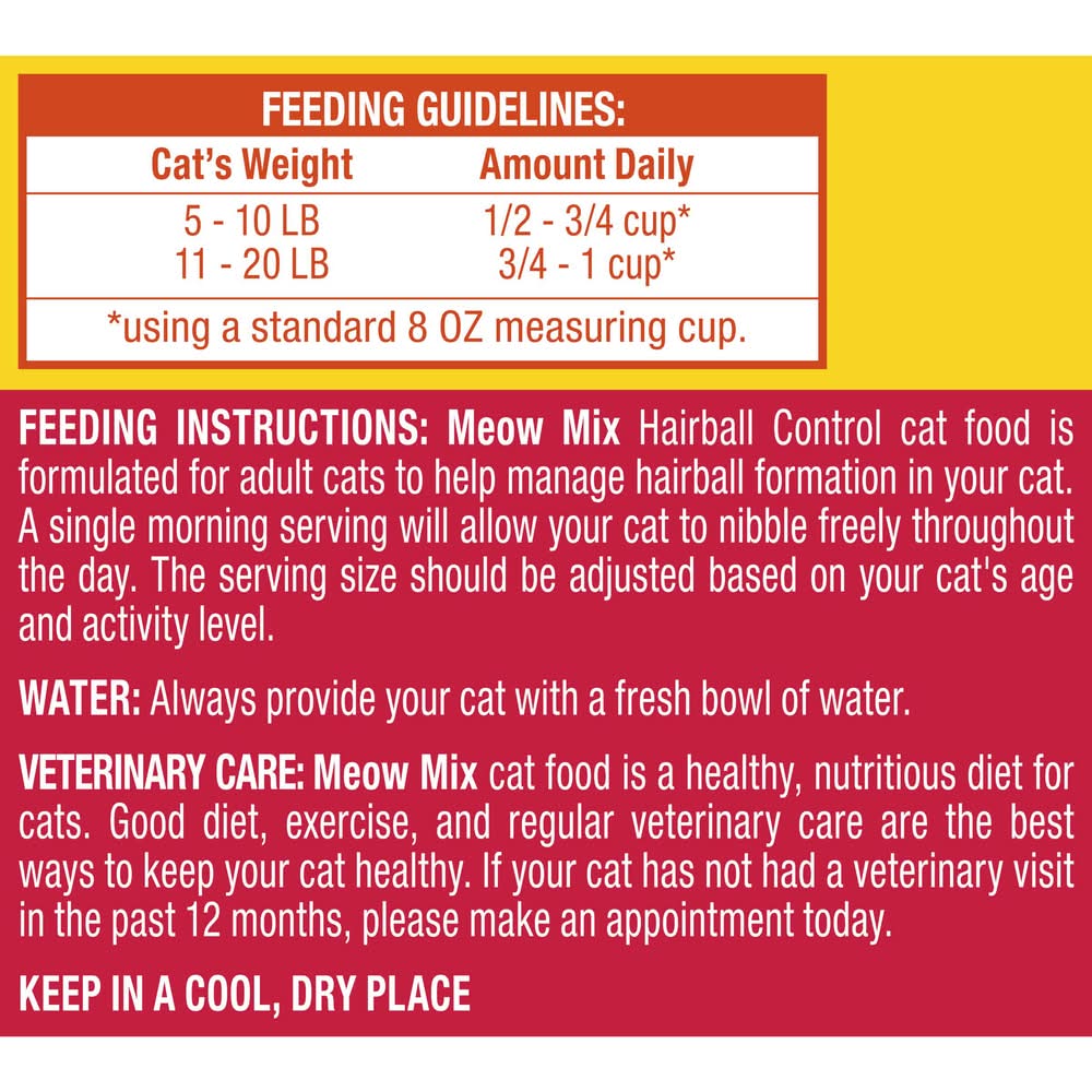 Directions for use: Guaranteed fresh if used by date.Feeding Instructions: Meow Mix Hairball Control cat food is formulated for adult cats to help manage hairball formation in your cat. A single morning serving will allow your cat to nibble freely throughout the day. The serving size should be adjusted based on your cat's age and activity level. When introducing Meow Mix cat food, gradually mix it with your cat's current food over the course of 7-10 days. Water: Always provide your cat with a fresh bowl or water. Veterinary Care: Meow Mix cat food is a healthy, nutritious diet for cats. Good diet, exercise, and regular veterinary care are the best ways to keep your cat healthy. If your cat has not had a veterinary visit in the past 12 months, please make an appointment today. Feeding Guidelines: Cat’s Weight: 5 - 9 lb; Amount Daily (using a standard 8 OZ measuring cup): 1/2 - 1 cup. Cat’s Weight: 10 - 14 lb; Amount Daily (using a standard 8 OZ measuring cup): 1 - 1-1/2 cups. Storage recommendation: Keep in a cool, dry place.