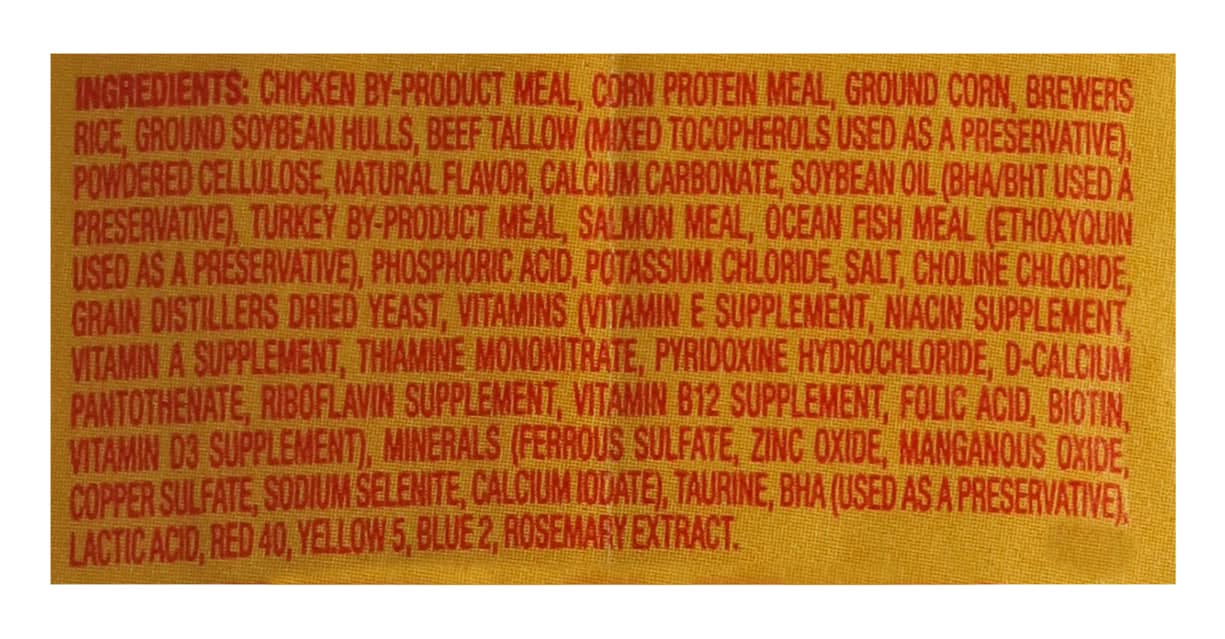 Ingredients: Chicken By-Product Meal, Corn Protein Meal, Ground Corn, Brewers Rice, Ground Soybean Hulls, Beef Tallow (Mixed Tocopherols Used As A Preservative), Powdered Cellulose, Soybean Oil (Bha/BHT Used A Preservative), Natural Flavor, Calcium Carbonate, Turkey By-Product Meal, Salmon Meal, Ocean Fish Meal (Ethoxyquin Used As A Preservative), Phosphoric Acid, Potassium Chloride, Salt, Sodium Acid Pyrophosphate, Choline Chloride, Vitamins (Vitamin E Supplement, Niacin Supplement, Vitamin A Supplement, Thiamine Mononitrate, Pyridoxine Hydrochloride, D-Calcium Pantothenate, Riboflavin Supplement, Vitamin B12 Supplement, Folic Acid, Biotin, Vitamin D3 Supplement), Grain Distillers Dried Yeast, Taurine, Minerals (Ferrous Sulfate, Zinc Oxide, Manganous Oxide, Copper Sulfate, Sodium Selenite, Calcium Iodate), Red 40, Lactic Acid, Yellow 5, Blue 2, Bha (Used As A Preservative), Rosemary Extract Contains: Soybeans, Salmon, Fish
