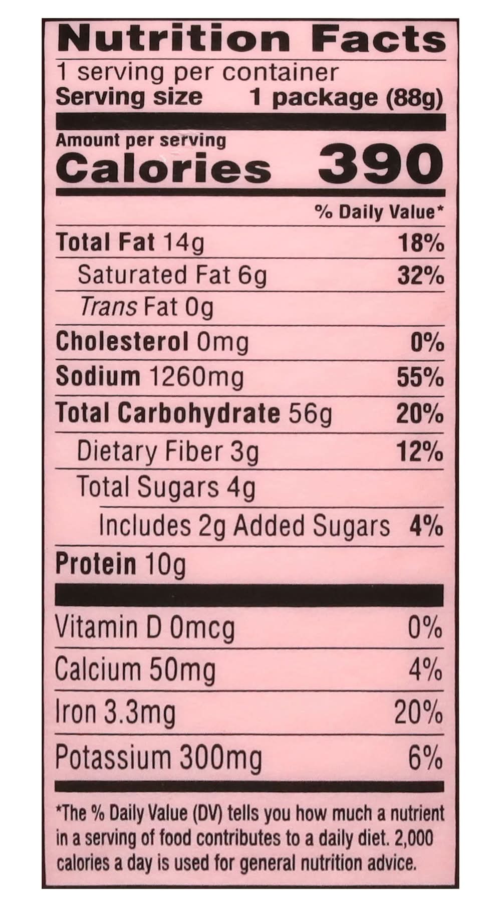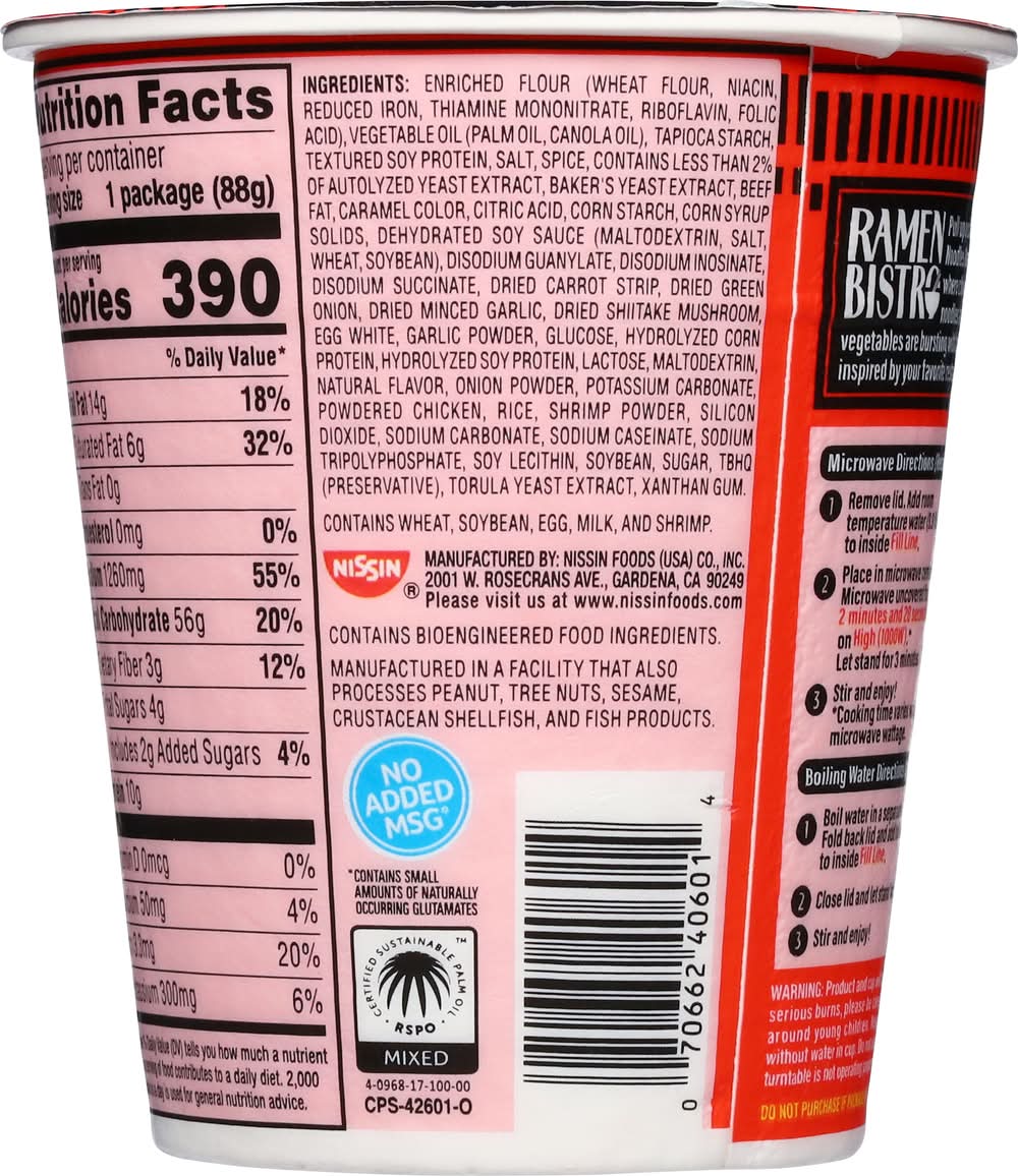 Ingredients: Enriched Flour (Wheat Flour, Niacin, Reduced Iron, Thiamine Mononitrate, Riboflavin, Folic Acid), Vegetable Oil (Palm Oil, Canola Oil), Tapioca Starch, Textured Soy Protein, Salt, Spice, Contains Less than 2% of Autolyzed Yeast Extract, Baker's Yeast Extract, Beef Fat, Caramel Color, Citric Acid, Corn Starch, Corn Syrup Solids, Dehydrated Soy Sauce (Maltodextrin, Salt, Wheat, Soybean), Disodium Guanylate, Disodium Inosinate, Disodium Succinate, Dried Carrot Strip, Dried Green Onion, Dried Minced Garlic, Dried Shiitake Mushroom, Egg White, Garlic Powder, Glucose, Hydrolyzed Corn Protein, Hydrolyzed Soy Protein, Lactose, Maltodextrin, Natural Flavor, Onion Powder, Potassium Carbonate, Powdered Chicken, Rice, Shrimp Powder, Silicon Dioxide, Sodium Carbonate, Sodium Caseinate, Sodium Tripolyphosphate, Soy Lecithin, Soybean, Sugar, TBHQ (Preservative), Torula Yeast Extract, Xanthan Gum Contains: Wheat, Soybeans, Eggs, Milk, Crustacean Shellfish, Shrimp, Lactose, Peanuts, Tree Nuts, Sesame, Crustacean Shellfish, Fish