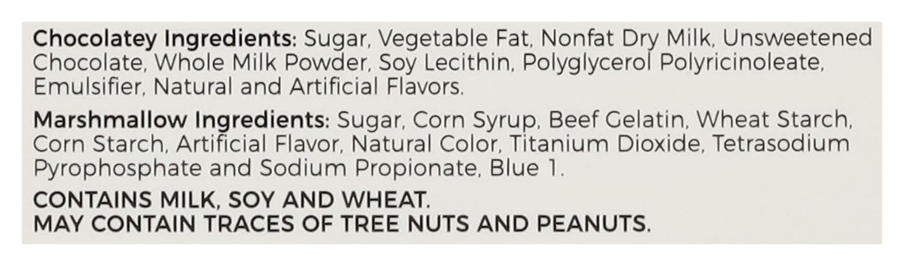 Ingredients: Chocolatey Ingredients: Sugar, Vegetable Fat, Nonfat Dry Milk, Unsweetened Chocolate, Whole Milk Powder, Soy Lecithin, Polyglycerol Polyricinoleate, Emulsifier, Natural and Artificial Flavors, Marshmallow Ingredients: Sugar, Corn Syrup, Beef Gelatin, Wheat Starch, Corn Starch, Artificial Flavor, Natural Color, Titanium Dioxide, Tetrasodium Pyrophosphate and Sodium Propionate, Blue 1 Contains: Milk, Soybeans, Wheat, Tree Nuts, Peanuts