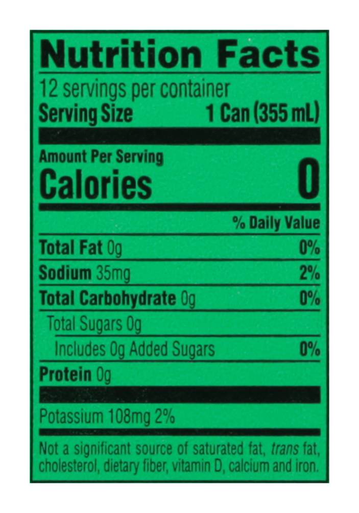 Each can contains no calories saturated fat sugar or caffeine. The beverage comes conveniently packaged ideal for stocking your fridge. With a subtle hint of sodium at 35 mg per serving, it provides a crisp, clean taste. • Flavor: Lemon-lime • Pack size: 12 • Size: 144 OZ • The Coca-cola Company, Atlanta GA 30313 • Packaging: Reusable