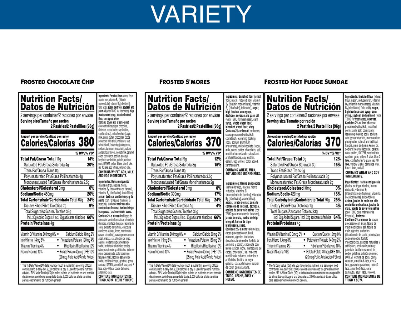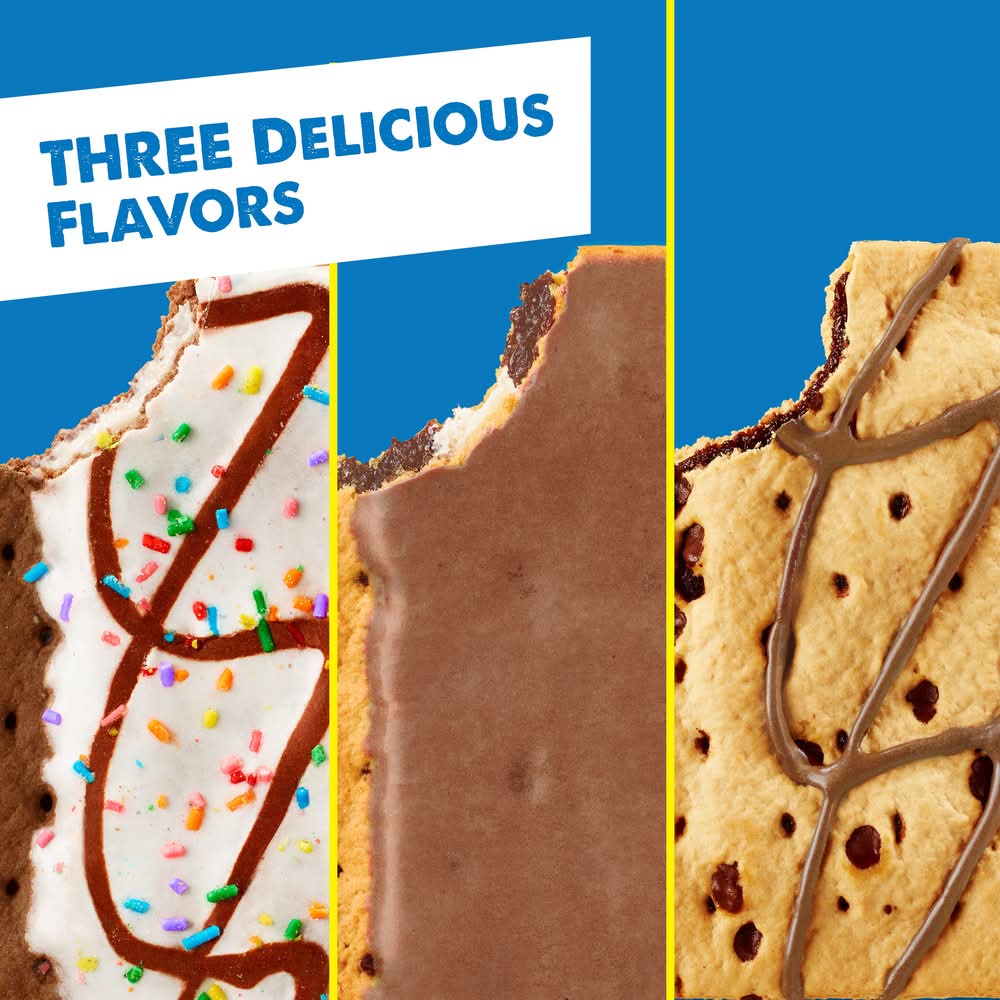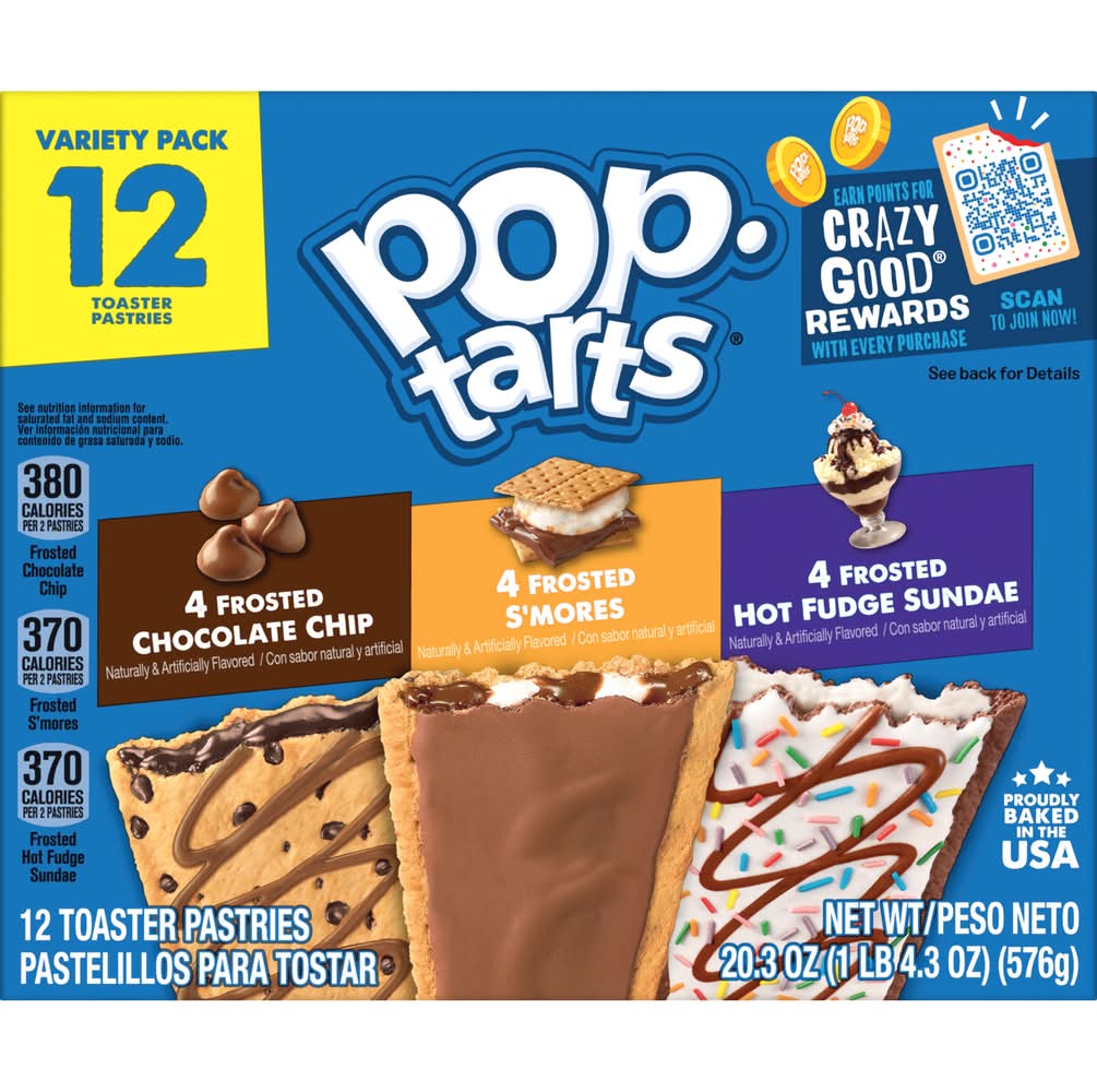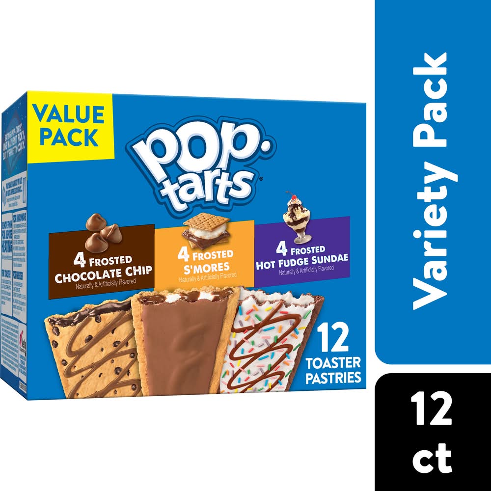 Pop-Tarts toaster pastries are the perfect sweet treat at breakfast, for lunch snack time, or dessert. Featuring a variety of sweet flavored fillings in a frosted soft pastry crust, this ready to eat treat is perfect for snack time for kids and adults on the go. Pack your choice of Pop-Tarts Frosted Chocolate Chip, Frosted Hot Fudge Sundae, and Frosted S'mores in lunchboxes or backpacks when it's time for school snacking, or stock the office pantry with this individually wrapped grab and go adult snack time choice. Pop them in the toaster and pair with milk, create your own ice cream sandwiches, or incorporate into your favorite dessert recipe for a sweet treat. These irresistible snack time options for kids and adults provide a good source of three B vitamins. Stock your pantry with these shelf stable snack alternatives and enjoy ready to eat treats anytime. A flavor for everyone, including fan-favorite flavors, like Frosted Strawberry or Frosted Blueberry. • Flavor: Frosted chocolate chip-frosted s'mores-frosted hot fudge sundae • Size: 12 CT