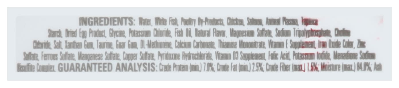 Ingredients: Water, White Fish, Poultry By-Products, Chicken, Salmon, Animal Plasma, Tapioca Starch, Dried Egg Product, Glycine, Potassium Chloride, Fish Oil, Natural Flavor, Magnesium Sulfate, Sodium Tripolyphosphate, Choline Chloride, Salt, Xanthan Gum, Taurine, Guar Gum, DL-Methionine, Calcium Carbonate, Thiamine Mononitrate, Vitamin E Supplement, Iron Oxide Color, Zinc Sulfate, Ferrous Sulfate, Manganese Sulfate, Copper Sulfate, Pyridoxine Hydrochloride, Vitamin D3 Supplement, Folic Acid, Potassium Iodide, Menadione Sodium Bisulfite Complex Contains: Fish, Fish, Salmon, Eggs, Sulfites