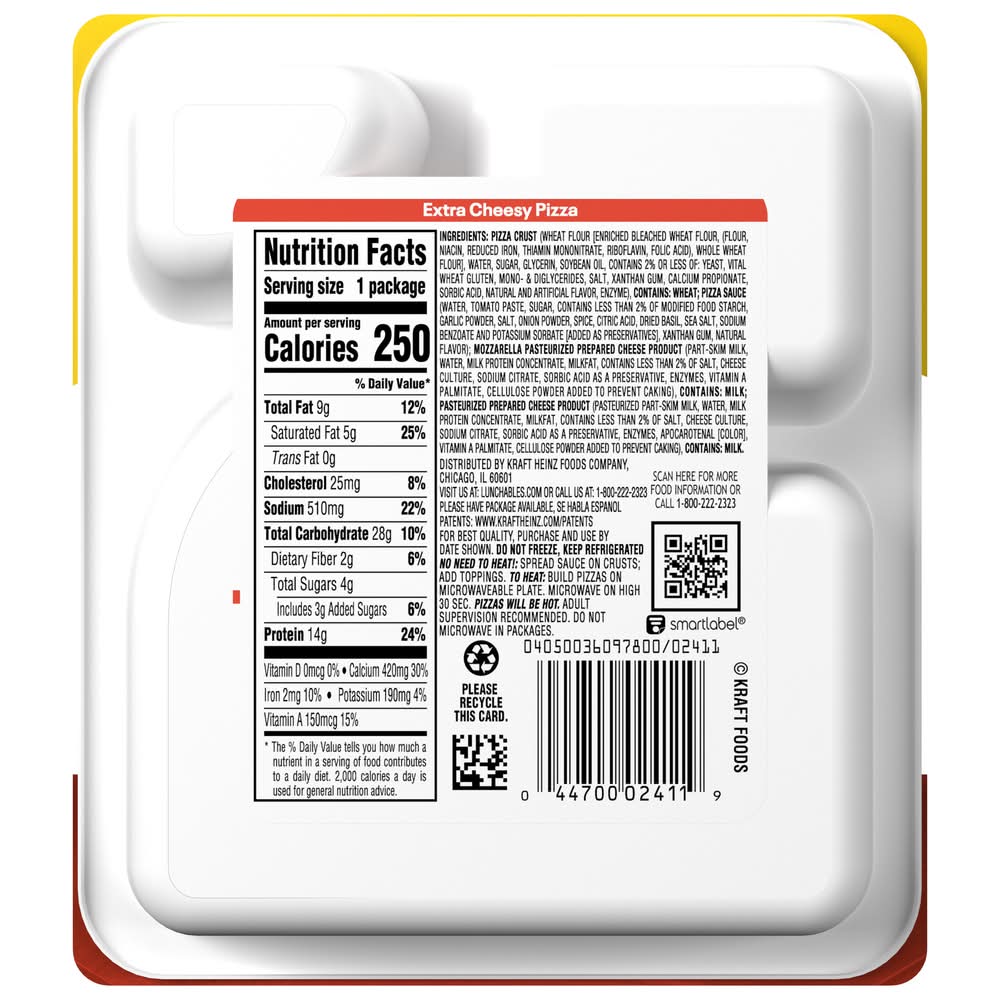 Built to be eaten, our Lunchables Extra Cheesy Pizza tray is the perfect option for a convenient snack kids will enjoy any time of day! Our pizza snack kit features real, epic food including pizza crusts, pizza sauce and Kraft cheese blend. Great for on the go, each ingredient comes in its own individual compartment in our serving tray, making it easy and fun to build your own unique combinations. Every 4.2 ounce plastic tray contains 14 grams of protein per serving. Always remember to keep your Lunchables pizza refrigerated until you are ready to experience a delicious snack. • Size: 4.2 OZ • Kraft Heinz Foods Company, Chicago,IL,60601 • Packaging: Reusable