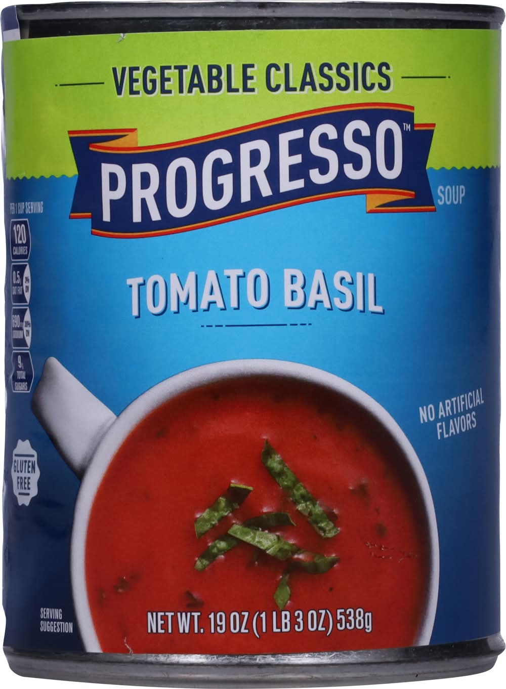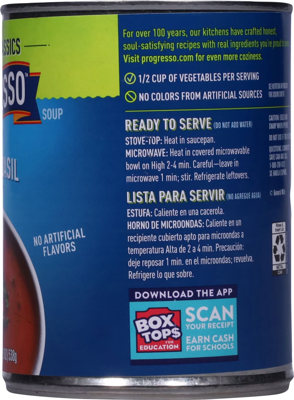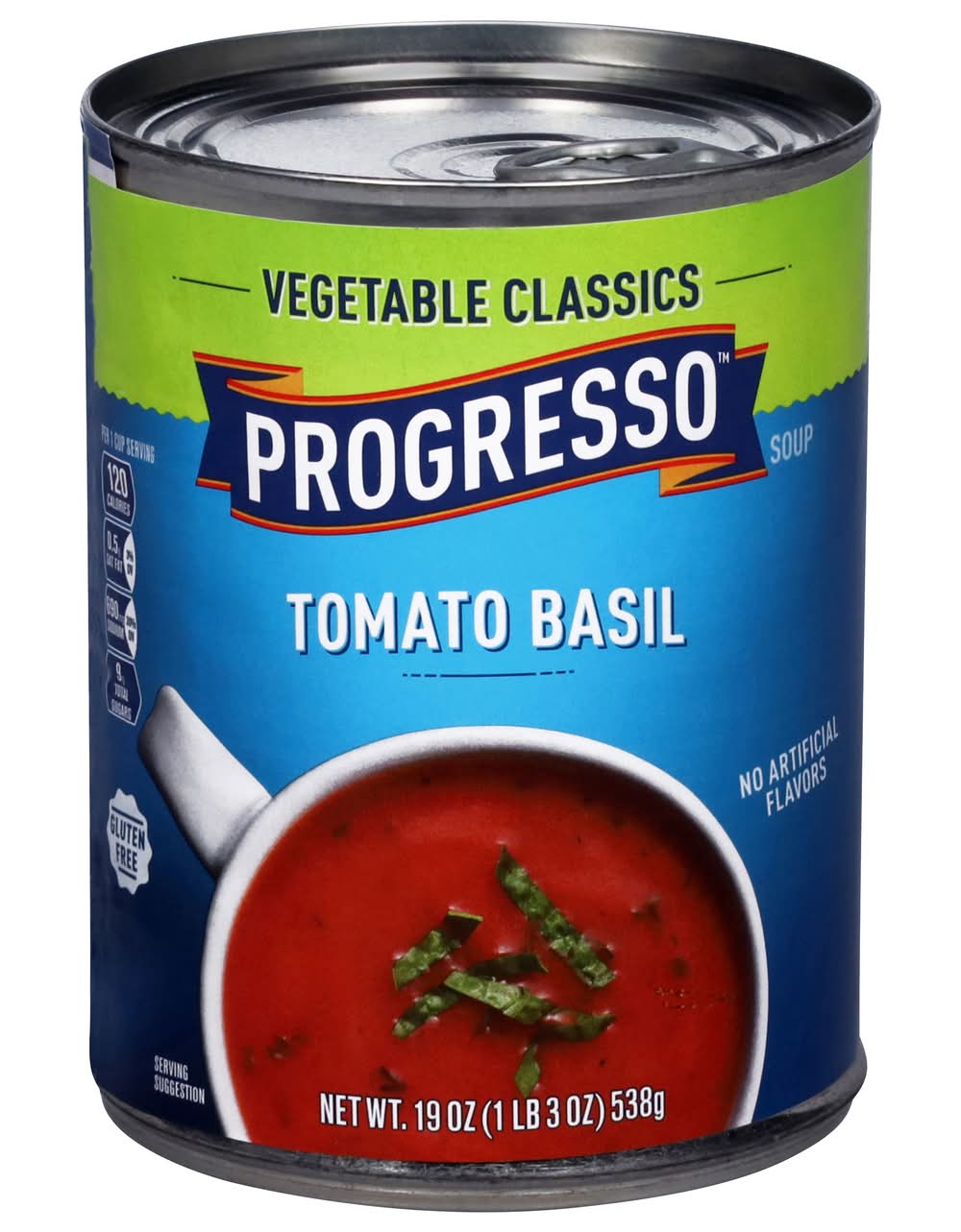 Progresso Vegetable Classics Tomato Basil Soup is a classic tomato soup packed with heartwarming goodness. It's great for days when you crave an easy mealtime addition or want to warm up from the inside out. Whether it's part of a delicious lunch or dinner, add Progresso canned soups to your shopping list as a favorite comfort food. This gluten free canned soup contains one-half cup of vegetables per serving, and no artificial flavors or colors from artificial sources. Unlike instant ramen, Progresso Soup is ready to serve, no need to add water. • Flavor: Tomato basil • Size: 19 OZ • General Mills Sales, Inc., Minneapolis, MN, 55440 • Packaging: Reusable