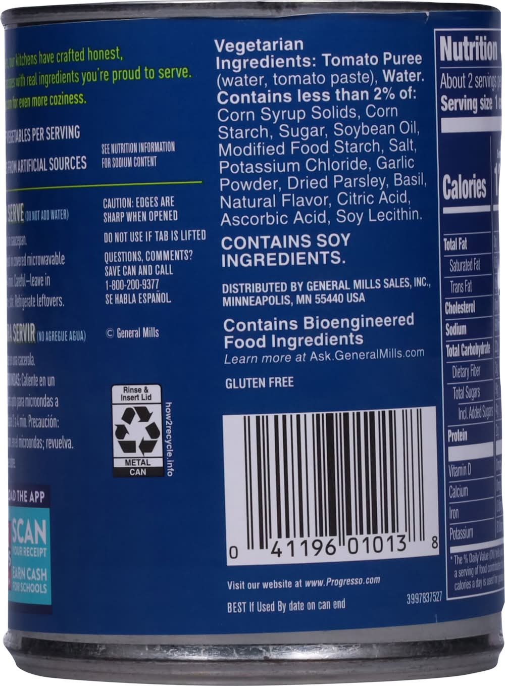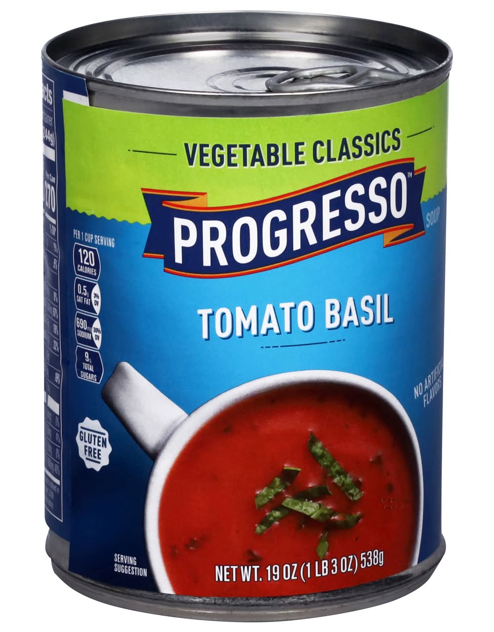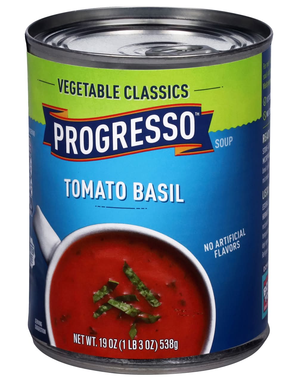 Progresso Vegetable Classics Tomato Basil Soup is a classic tomato soup packed with heartwarming goodness. It's great for days when you crave an easy mealtime addition or want to warm up from the inside out. Whether it's part of a delicious lunch or dinner, add Progresso canned soups to your shopping list as a favorite comfort food. This gluten free canned soup contains one-half cup of vegetables per serving, and no artificial flavors or colors from artificial sources. Unlike instant ramen, Progresso Soup is ready to serve, no need to add water. • Flavor: Tomato basil • Size: 19 OZ • General Mills Sales, Inc., Minneapolis, MN, 55440 • Packaging: Reusable
