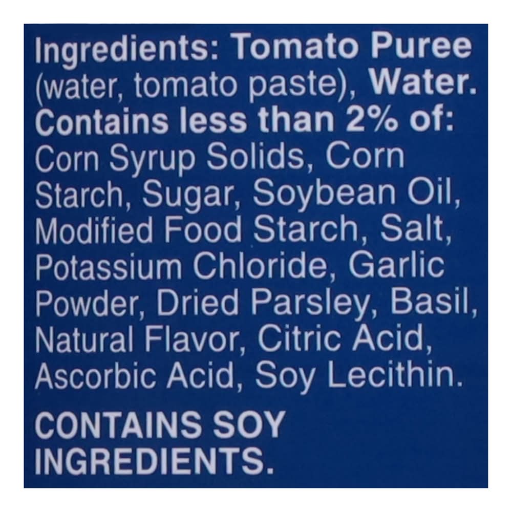 Ingredients: Tomato Puree (Water, Tomato Paste), Water, Contains Less than 2% of: Corn Syrup Solids, Corn Starch, Sugar, Soybean Oil, Modified Food Starch, Salt, Potassium Chloride, Garlic Powder, Dried Parsley, Basil, Natural Flavor, Citric Acid, Ascorbic Acid, Soy Lecithin. Contains: Soybeans