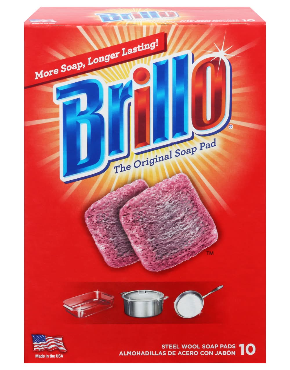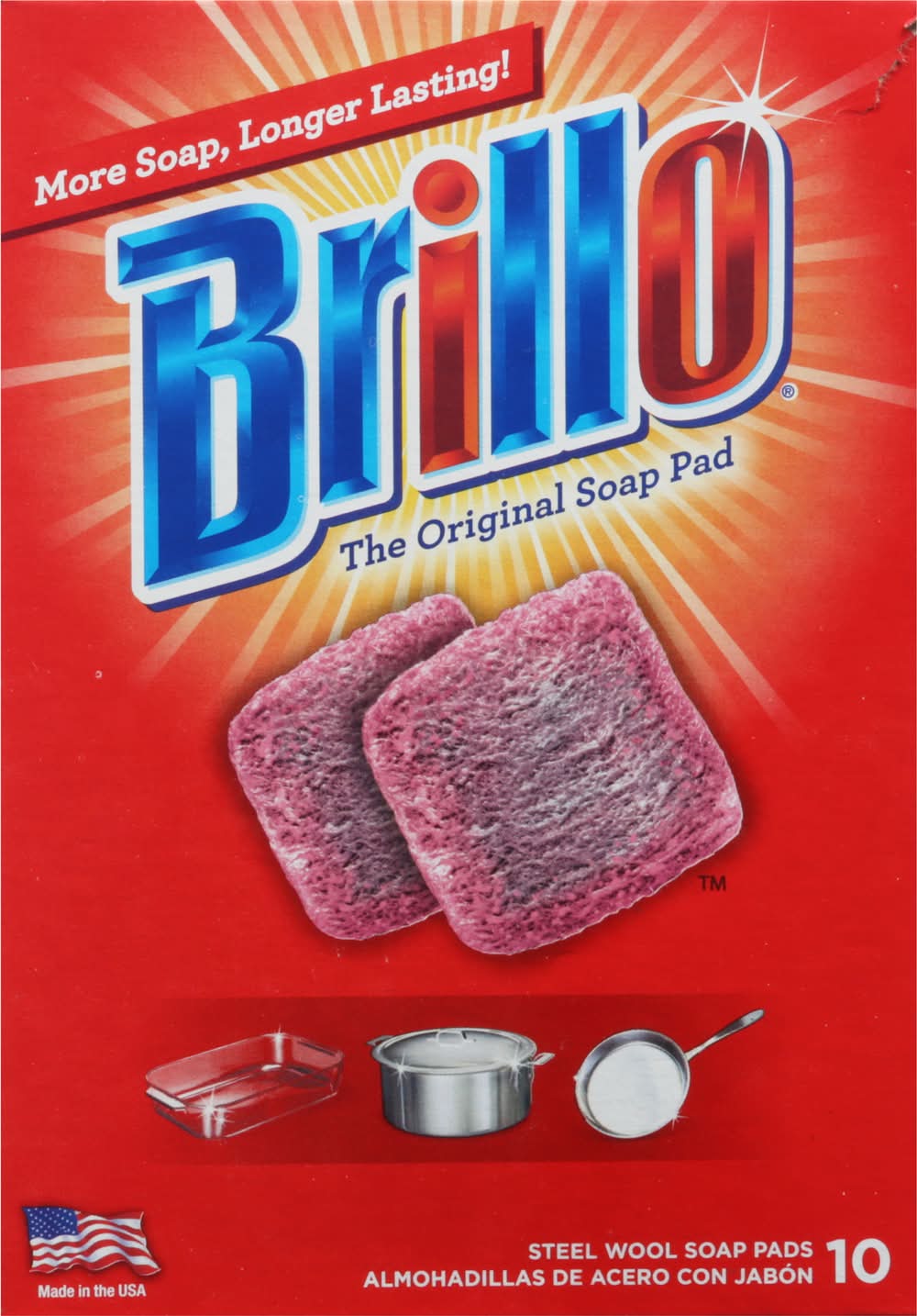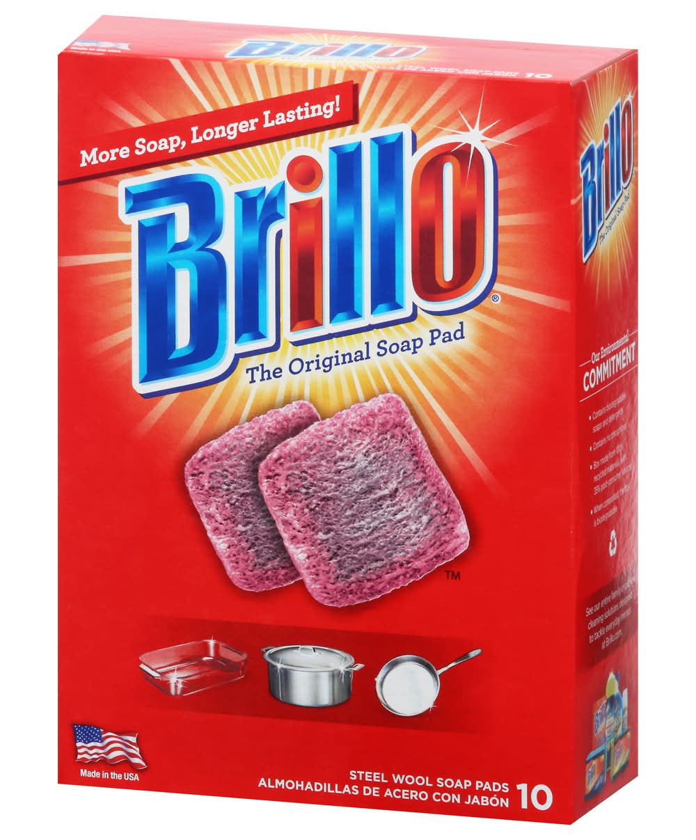More soap, longer lasting! The original soap pad. Original Grease Fighting Soap: Cuts through tough messes. Bonded Edges: Maintains shape of pad. Anti-Rust Formula: Resists rust. Brilliant beyond the sink. Brillo helps cut through grime and leaves tough-to-clean surfaces brilliant. Cookware: Silverware; Dishes & bowls; Bakeware; Glassware; Utensils; Pots & pans. Indoors: Stovetops & ovens; Burners; Tile floors; Countertops; Ttainless-steel sinks; Glass shower doors. Outdoors: Barbecue grills; Tires/wheels; Machinery & tools, Outdoor patio; Furniture; Golf clubs. Family-owned since 1908.See our entire family of proven cleaning solutions designed to tackle everyday messes at Brillo.com. Our Environmental Commitment: Contains biodegradable soaps and detergents; Contains no phosphorus; Box made from 100% recycled materials, with 35% post-consumer sources; When composted, the box is biodegradable. Made in the USA. • Size: 10 CT • Packaging: Reusable