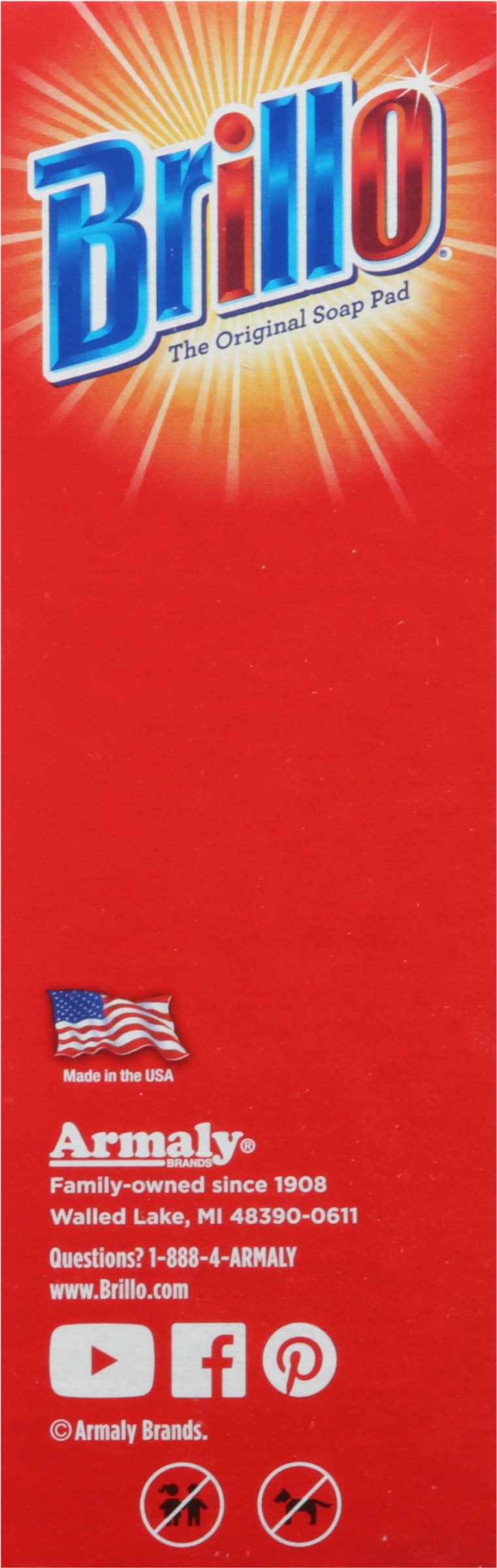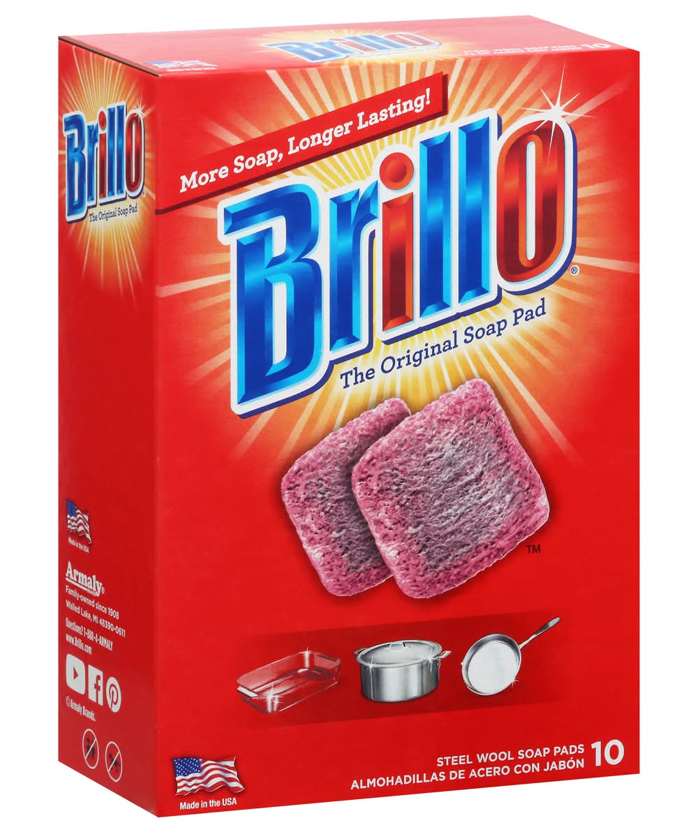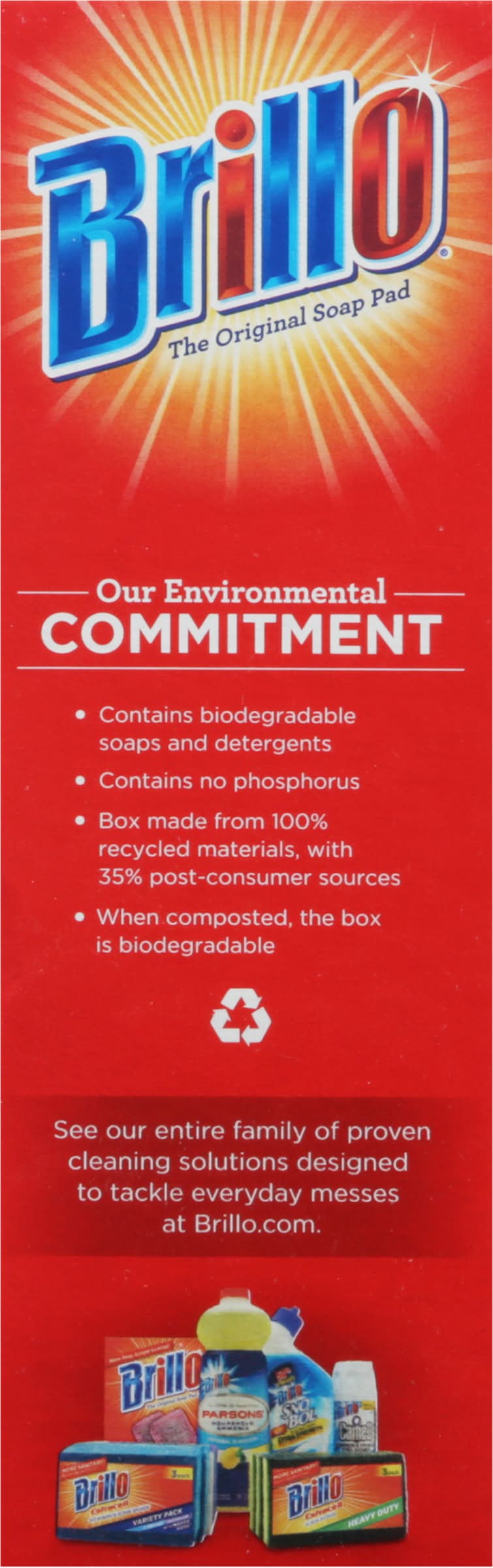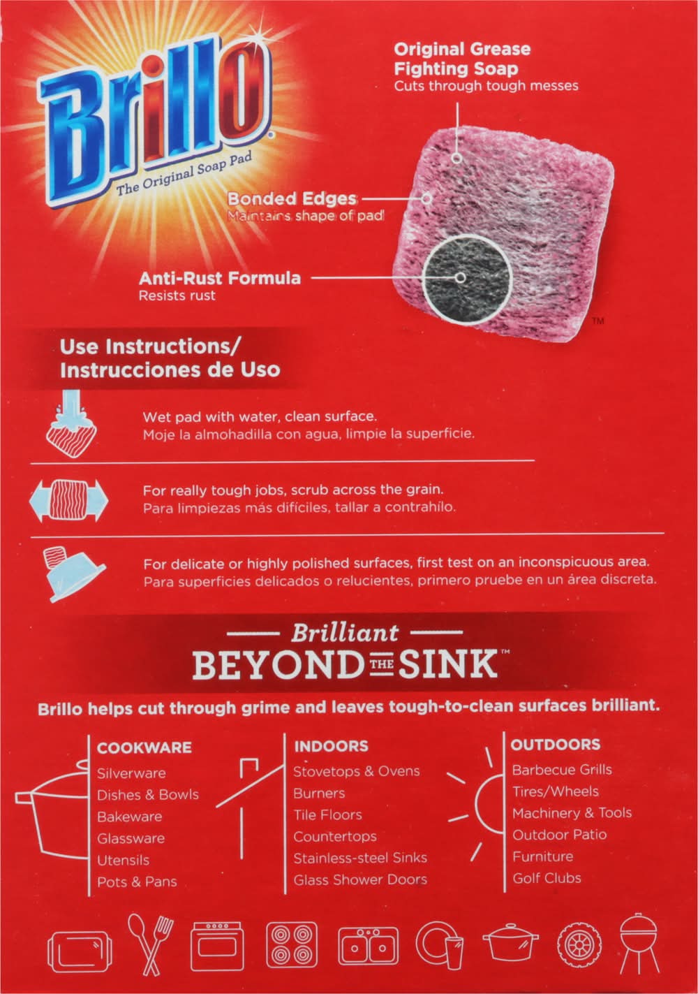 More soap, longer lasting! The original soap pad. Original Grease Fighting Soap: Cuts through tough messes. Bonded Edges: Maintains shape of pad. Anti-Rust Formula: Resists rust. Brilliant beyond the sink. Brillo helps cut through grime and leaves tough-to-clean surfaces brilliant. Cookware: Silverware; Dishes & bowls; Bakeware; Glassware; Utensils; Pots & pans. Indoors: Stovetops & ovens; Burners; Tile floors; Countertops; Ttainless-steel sinks; Glass shower doors. Outdoors: Barbecue grills; Tires/wheels; Machinery & tools, Outdoor patio; Furniture; Golf clubs. Family-owned since 1908.See our entire family of proven cleaning solutions designed to tackle everyday messes at Brillo.com. Our Environmental Commitment: Contains biodegradable soaps and detergents; Contains no phosphorus; Box made from 100% recycled materials, with 35% post-consumer sources; When composted, the box is biodegradable. Made in the USA. • Size: 10 CT • Packaging: Reusable