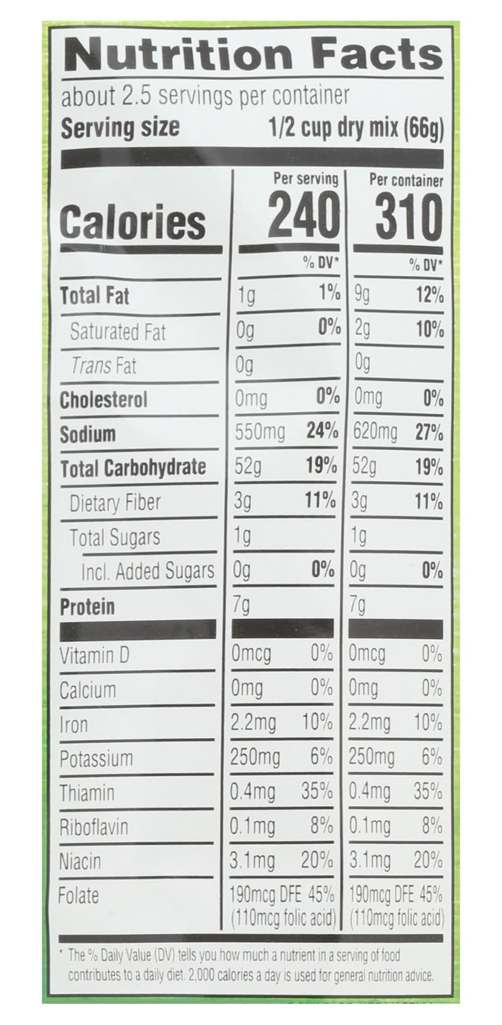 Ingredients: Parboiled Long Grain Rice, Vermicelli (Wheat Flour, Durum Flour), Less than 2% of: Corn Starch, Maltodextrin, Salt, Spices, Onion Powder, Garlic Powder, Red Bell Peppers, Chili Powder, Potassium Salt, Sugar, Chicken Fat, Silicon Dioxide (Prevents Caking), Natural Flavor, Yeast Extract, Parsley, Turmeric (for Color), Disodium Guanylate, Disodium Inosinate, Annatto Extract (for Color), Monosodium Glutamate, Vitamins and Minerals: Niacin, Ferric Orthophosphate (Iron), Thiamine Mononitrate (Vitamin B1), Riboflavin (Vitamin B2), Ferrous Sulfate (Iron), Folic Acid Contains: Wheat, Corn Additives: Genetically Modified Ingredients