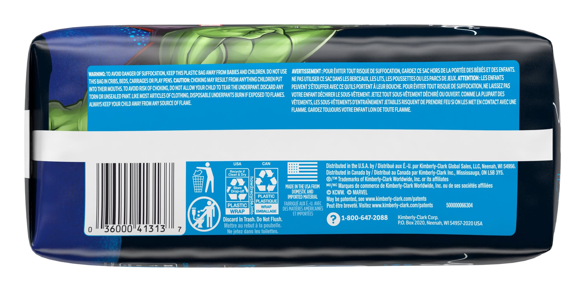 Fits Sizes: 6-8: 43-68 lbs (20-31 kg). No.1 Nighttime underwear (Youth pant category share data). Boys. 40% more protection vs. leading training pant. Odor absorbing. Super stretchy sides. 5 layer protection. Protection for boys. Double leg barriers. Fun prints & patterns. Clothing Sizes: XS: 3-5 (28-43 lbs [13-20 kg]); S/M: 6-8 (43-68 lbs [20-31 kg]); L: 10-12 (68-95 lbs [31-43 kg]). XL: 14-20 [95-140+ lbs (43-64+ kg)]. Our best fit and protection guaranteed Dispose of properly. • Size: S/M • Kimberly-Clark Global Sales, LLC, Neenah, WI, 54956 • Packaging: Reusable