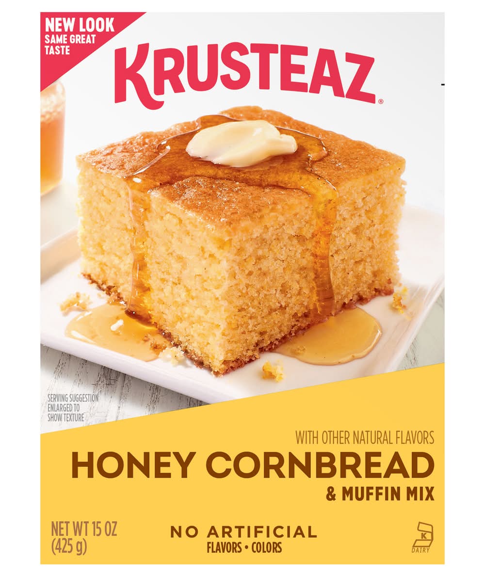 Get extra gold stars at the next potluck supper with Krusteaz crazy delicious honey cornbread. The sweet scent of honey and cornmeal is enough to tempt anyone’s taste buds, and you won’t have to ring the dinner bell more than once. Hint: Be sure to top this moist, delicious cornbread with melty butter right after it comes out of the oven, and you'll forever be known as “that epic cornbread maker”. • Flavor: Honey cornbread • Size: 15 OZ • Continental Mills, Inc., Seattle,WA,98138