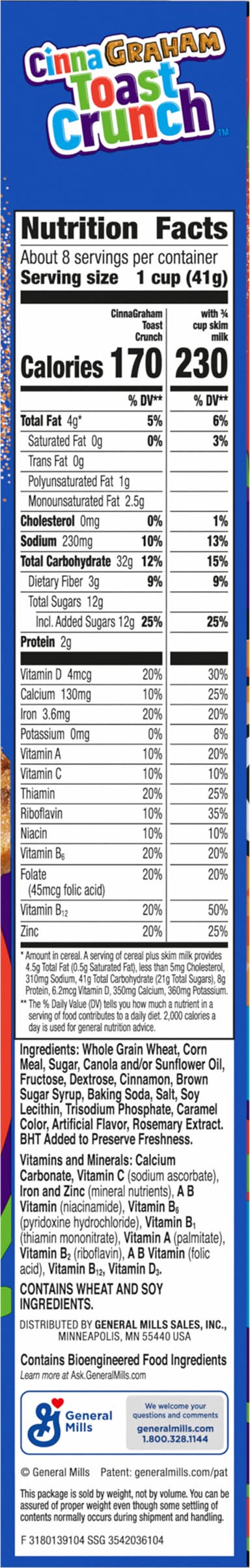 Ingredients: Whole Grain Wheat, Corn Meal, Sugar, Canola and/or Sunflower Oil, Fructose, Dextrose, Cinnamon, Brown Sugar Syrup, Baking Soda, Salt, Soy Lecithin, Trisodium Phosphate, Caramel Color, Artificial Flavor, Rosemary Extract. BHT Added to Preserve Freshness. Vitamins and Minerals: Calcium Carbonate, Vitamin C (Sodium Ascorbate), Iron and Zinc (Mineral Nutrients), a B Vitamin (Niacinamide), Vitamin B6 (Pyridoxine Hydrochloride), Vitamin B1 (Thiamin Mononitrate), Vitamin A (Palmitate), Vitamin B2 (Riboflavin), a B Vitamin (Folic Acid), Vitamin B12, Vitamin D3 Contains: Wheat, Soybeans, Corn