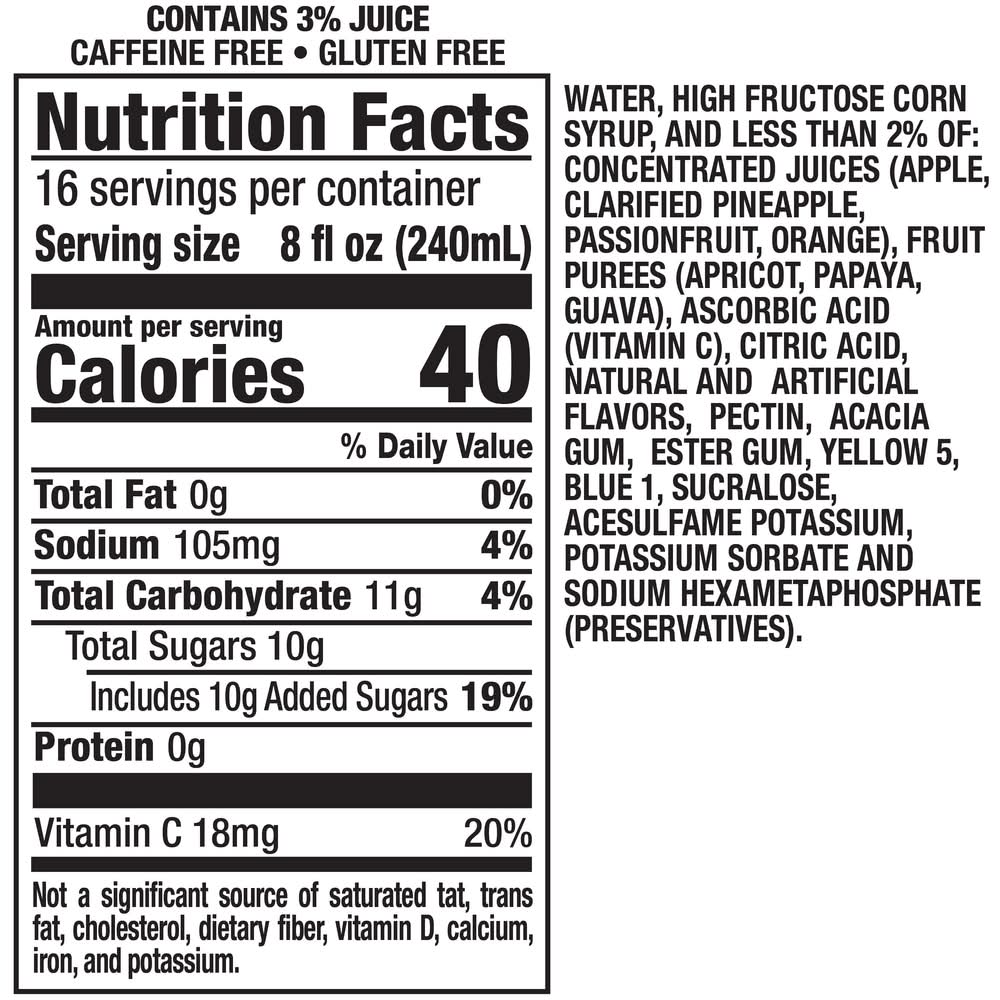 Ingredients: Water, High Fructose Corn Syrup, and Less than 2% of: Concentrated Juices Apple, Clarified Pineapple, Passionfruit, Orange, Fruit Purees Apricot, Papaya, Guava, Ascorbic Acid Vitamin C, Citric Acid, Natural and Artificial Flavors, Pectin, Acacia Gum, Ester Gum, Yellow 5, Blue 1, Sucralose, Acesulfame Potassium, Potassium Sorbate and Sodium Hexametaphosphate Preservatives. Contains: Corn