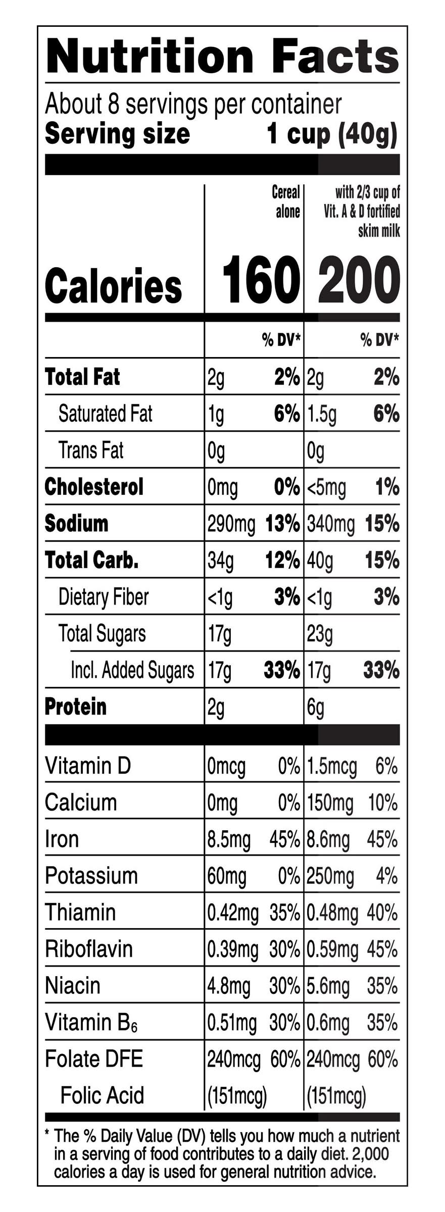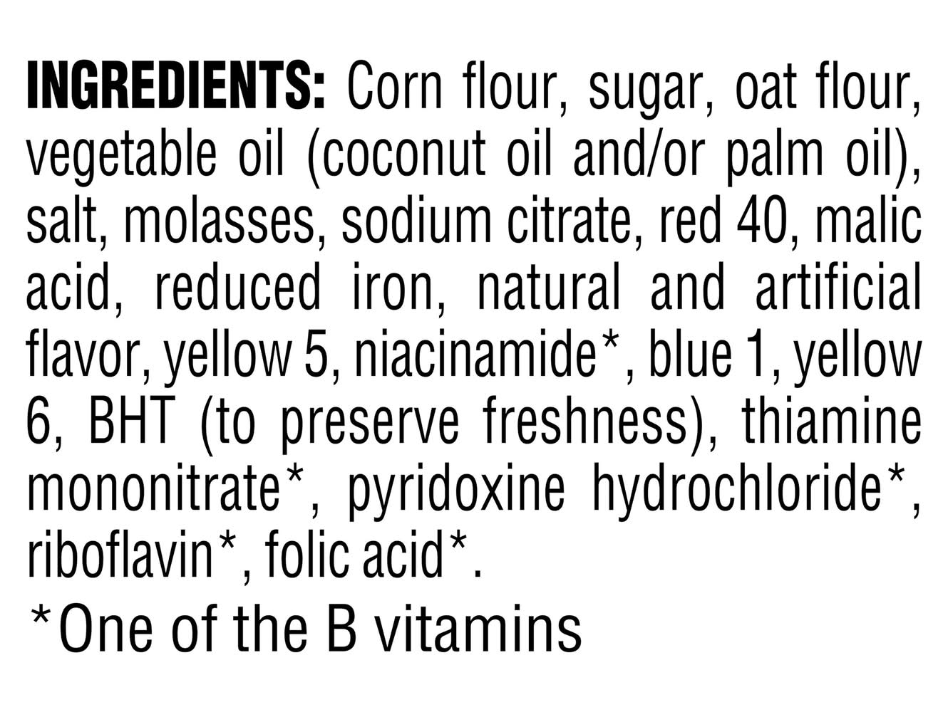 Ingredients: Corn Flour, Sugar, Oat Flour, Vegetable Oil (Coconut Oil And/Or Palm Oil), Salt, Molasses, Sodium Citrate, Red 40, Malic Acid, Reduced Iron, Natural And Artificial Flavor, Yellow 5, Niacinamide*, Blue 1, Yellow 6, Bht (To Preserve Freshness), Thiamine Mononitrate*, Pyridoxine Hydrochloride*, Folic Acid, Riboflavin Contains: Corn, Oat, Tree Nuts, Coconuts