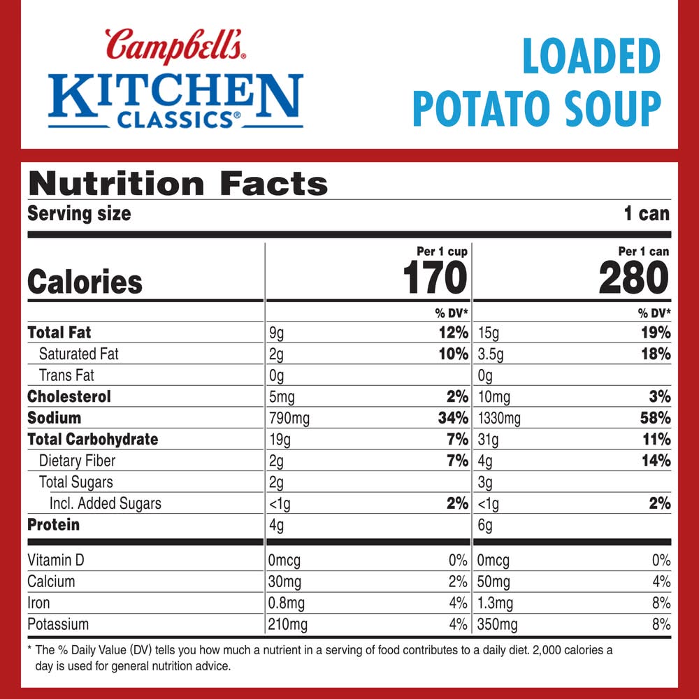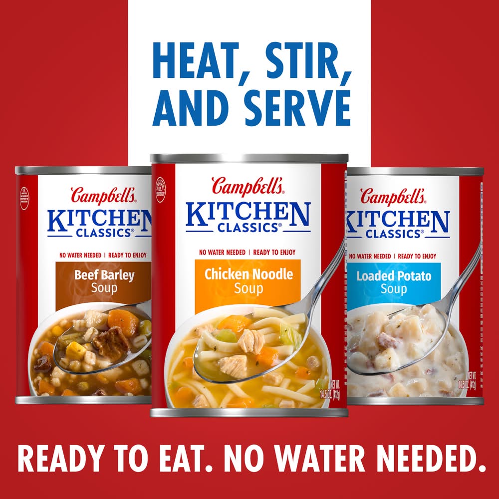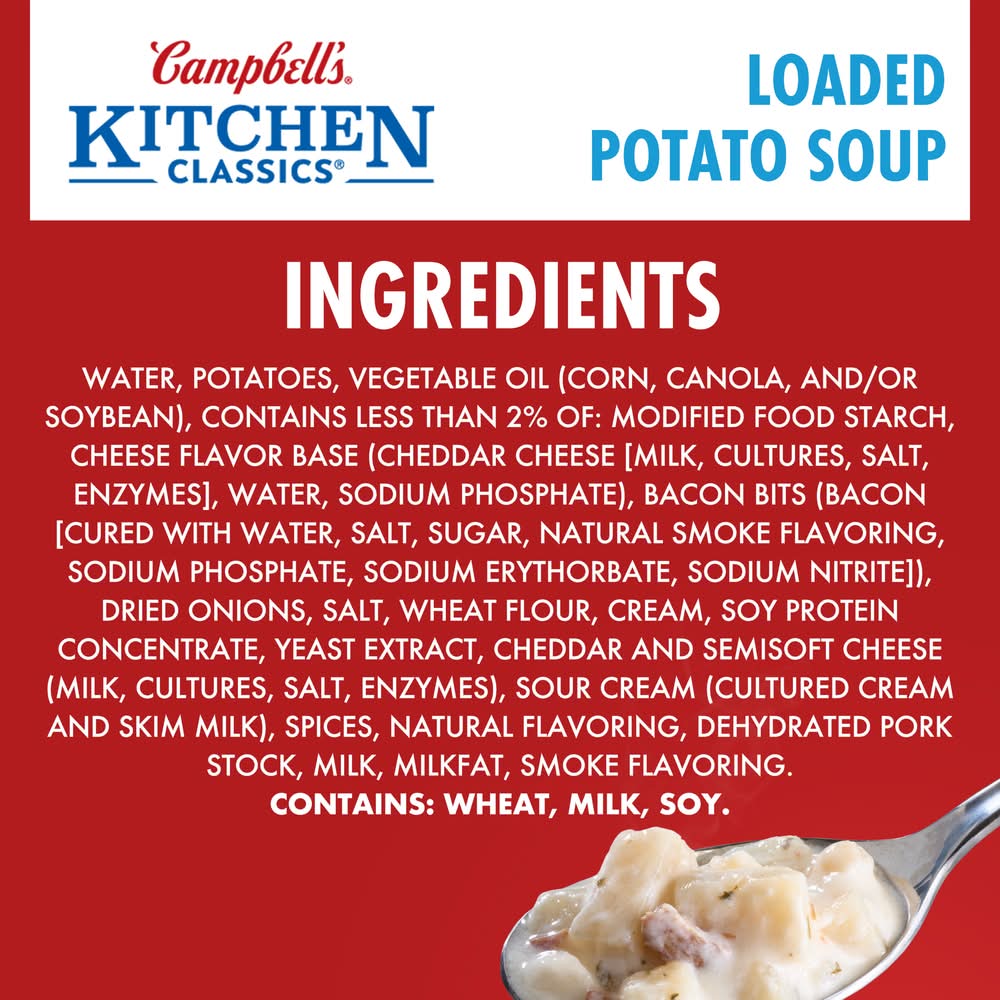 Campbell's Kitchen Classics soups bring the warmth of traditional, time-honored recipes to your table in every spoonful. Made with wholesome ingredients and crafted to capture the flavors you love, these soups are ready to eat with no water needed—perfect for any meal or moment. Whether you're savoring the comforting taste of Tomato Basil, Chicken Noodle, or enjoying other classic varieties, each bowl delivers a satisfying experience you can count on. Ideal for soup season or whenever you're craving something cozy, Campbell's Kitchen Classics soups are versatile enough to enjoy on their own or alongside a sandwich or salad. With their inviting flavors and comforting appeal, these soups make it easy to enjoy the tastes of tradition, whether you're taking a break from a busy day or gathering with loved ones. Warm up with Campbell's Kitchen Classics soups and rediscover the joy of a classic meal. Campbell's Kitchen Classics Loaded Potato Soup is crafted with hearty potatoes, flavorful bacon bits, with natural smoke flavoring that brings comfort to every bite. Ready to enjoy with no water needed, this deliciously satisfying soup is perfect on its own or paired with a sandwich or salad for a classic meal. Size: 14.5 OZ