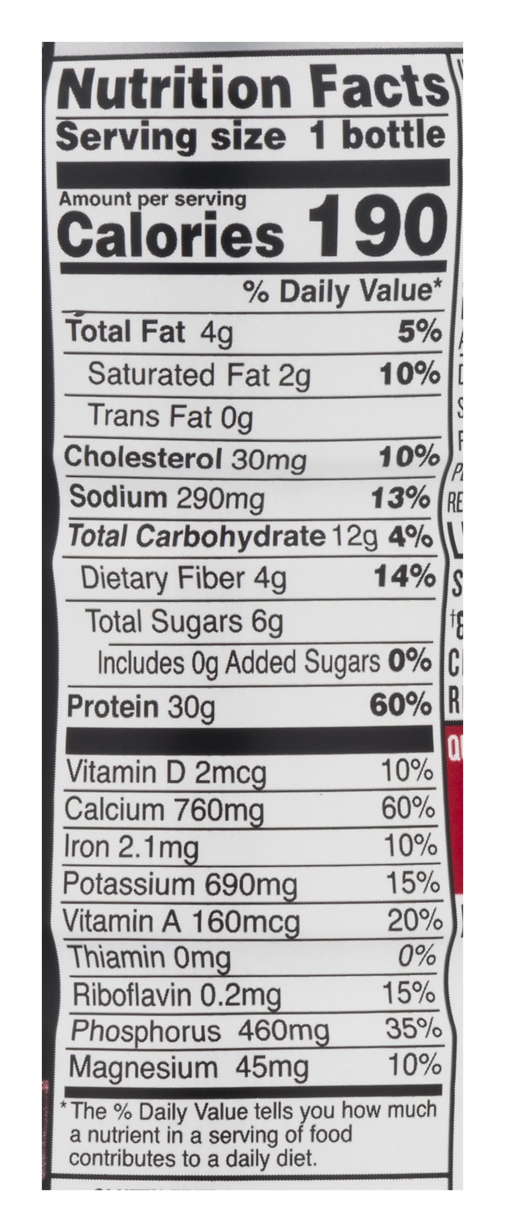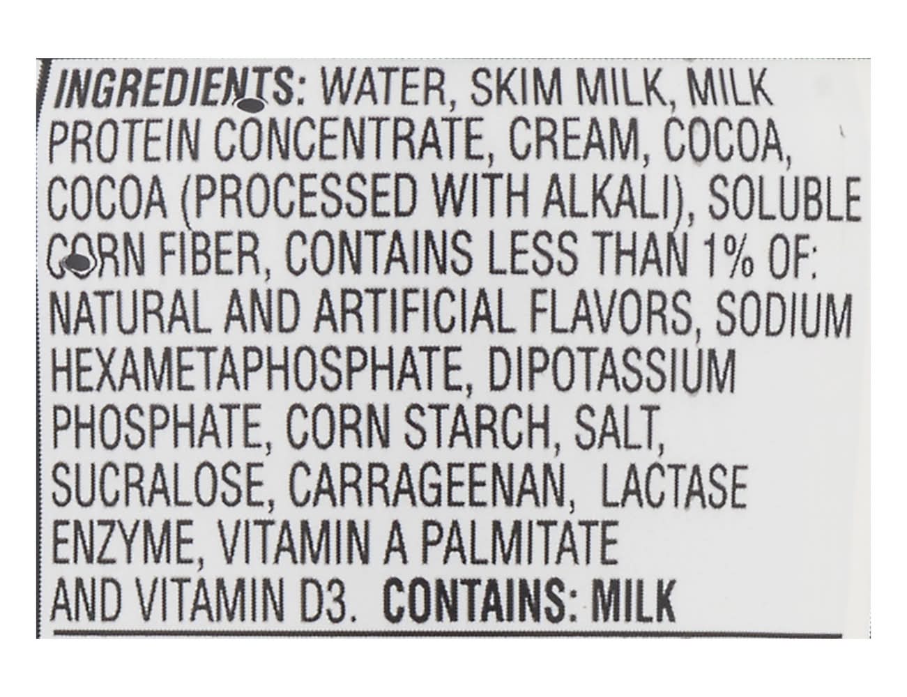 Ingredients: Water, Skim Milk, Milk Protein Concentrate, Cream, Cocoa, Cocoa (processed with Alkali), Soluble Corn Fiber, Contains less than 1% of: Natural and Artificial Flavors, Sodium Hexametaphosphate, Dipotassium Phosphate, Corn Starch, Salt, Sucralose, Carrageenan, Lactase Enzyme, Vitamin A Palmitate and Vitamin D3 Contains: Milk
