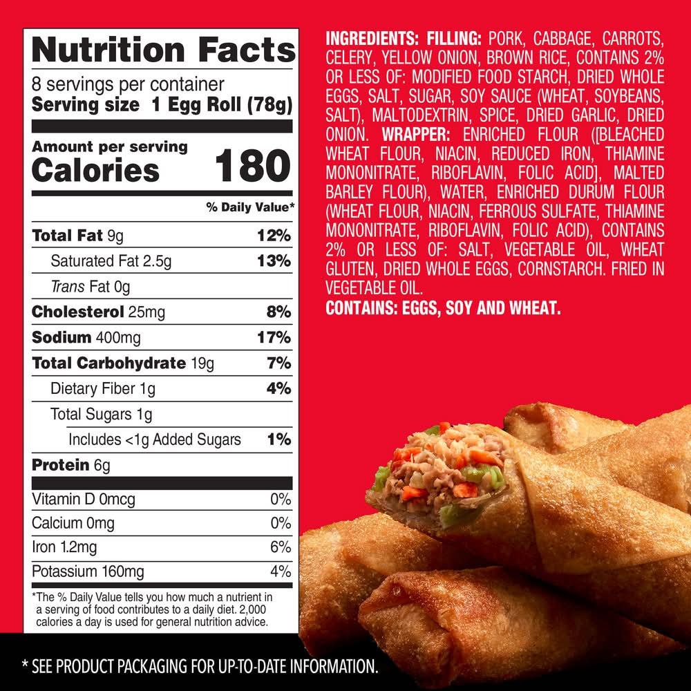 Ingredients: INGREDIENTS: FILLING: PORK, CABBAGE, CARROTS, CELERY, YELLOW ONION, BROWN RICE, CONTAINS 2% OR LESS OF: MODIFIED FOOD STARCH, SALT, SUGAR, SOY SAUCE (WHEAT, SOYBEANS, SALT), MALTODEXTRIN, SPICE, DRIED GARLIC, DRIED ONION. WRAPPER: ENRICHED FLOUR ([BLEACHED WHEAT FLOUR, NIACIN, REDUCED IRON, THIAMINE MONONITRATE, RIBOFLAVIN, FOLIC ACID], MALTED BARLEY FLOUR), WATER, ENRICHED DURUM FLOUR (WHEAT FLOUR, NIACIN, FERROUS SULFATE, THIAMINE MONONITRATE, RIBOFLAVIN, FOLIC ACID), CONTAINS 2% OR LESS OF: SALT, VEGETABLE OIL, WHEAT GLUTEN, DRIED WHOLE EGGS, CORN STARCH. FRIED IN VEGETABLE OIL. Contains: Eggs, Wheat, Soy