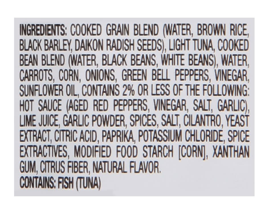 Ingredients: Cooked Grain Blend (Water, Brown Rice, Black Barley, Daikon Radish Seeds), Light Tuna, Cooked Bean Blend (Water, Black Beans, White Beans), Water, Carrots, Corn, Onions, Green Bell Peppers, Vinegar, Sunflower Oil, Contains 2% or Less of the Following: Hot Sauce (Aged Red Peppers, Vinegar, Salt, Garlic), Lime Juice, Garlic Powder, Spices, Salt, Cilantro, Yeast Extract, Citric Acid, Paprika, Potassium Chloride, Spice Extractives, Modified Food Starch [Corn], Xanthan Gum, Citrus Fiber, Natural Flavor Contains: Barley, Corn, Fish, Tuna