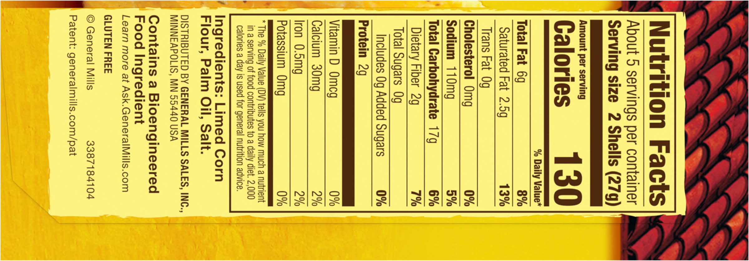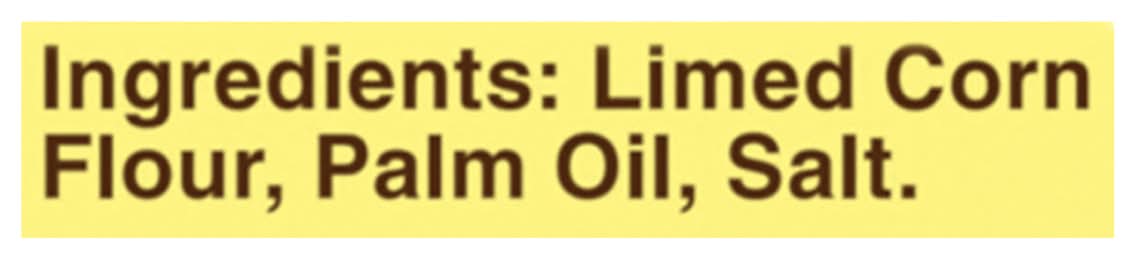 Ingredients: Limed Corn Flour, Palm Oil, Salt Contains: Corn