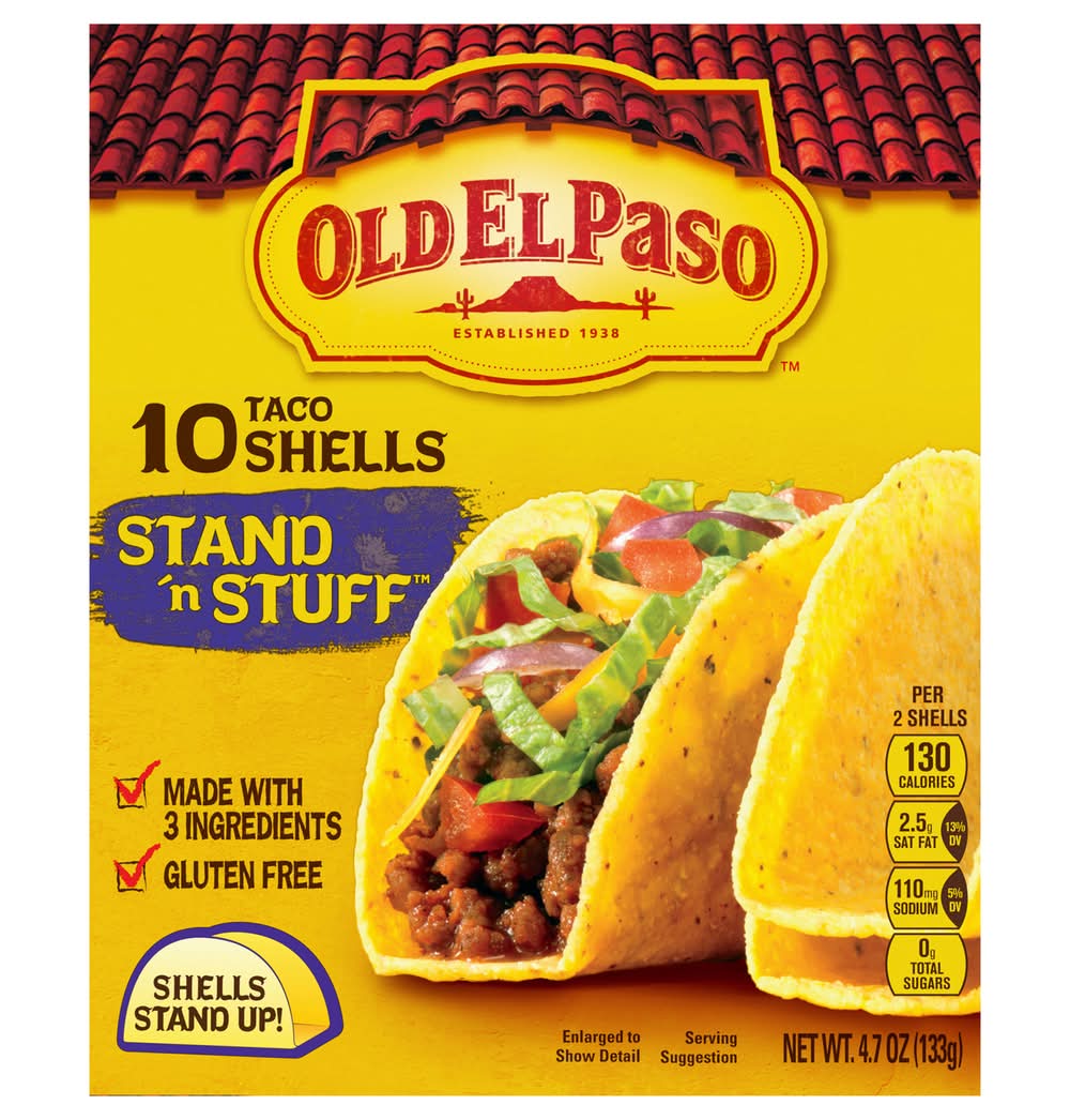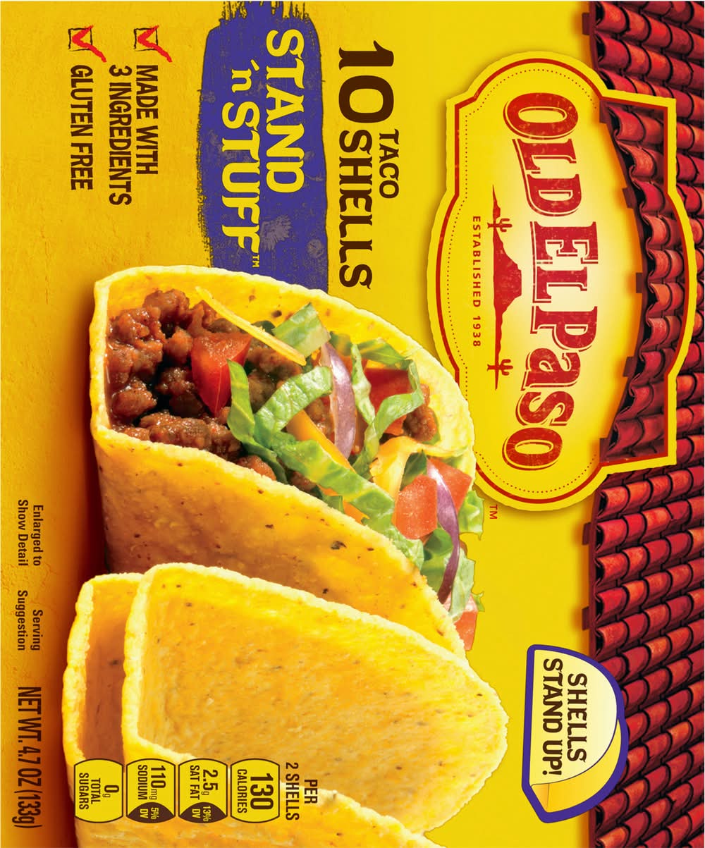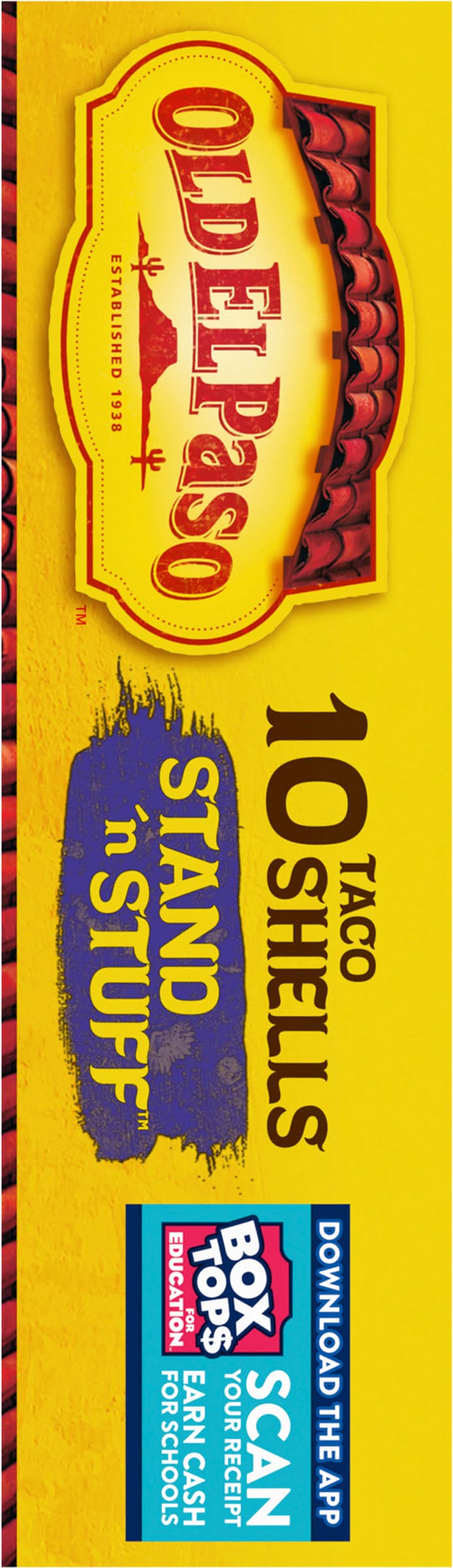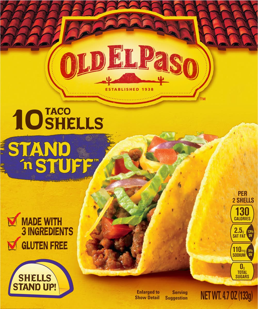 Make taco night a stand 'n invitation with Old El Paso Stand 'N Stuff Crunchy Taco Shells. These gluten free, hard taco shells have a flat bottom so they stand up on their own. Fill each one up with your favorite meats, cheeses, beans, and fresh toppings for a tasty food fiesta. They're easy to make - for max crunch, heat 'em up and enjoy an outstand in' Mexican-inspired meal! For more than 80 years, Old El Paso has been bringing families and communities together to celebrate old and new traditions around delicious, Mexican-inspired flavors. We believe that any night can be a taco night, and we're here to help make it a little easier and a lot more delicious. Our variety of crispy hard taco shells, tasty soft tortillas, flavorful seasonings, and much more help make taco night fun. • Size: 10 CT • General Mills Sales, Minneapolis,MN,55440,USA • Packaging: Reusable