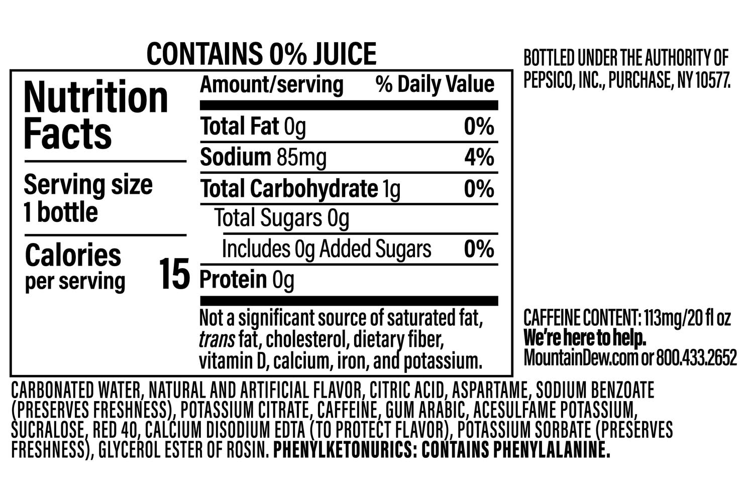 Ingredients: Carbonated Water, Natural And Artificial Flavor, Citric Acid, Aspartame, Sodium Benzoate (Preserves Freshness), Potassium Citrate, Caffeine, Gum Arabic, Acesulfame Potassium, Sucralose, Red 40, Calcium Disodium Edta (To Protect Flavor), Potassium Sorbate (Preserves Freshness), Glycerol Ester Of Rosin